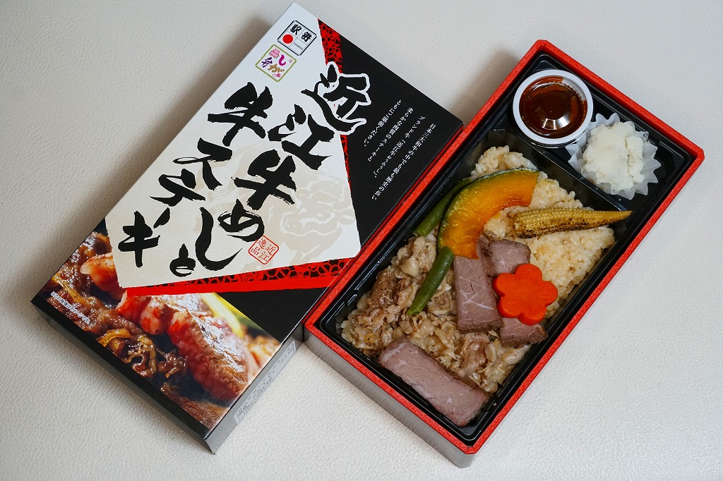 秋冬の駅弁大会シーズンに向けた、2020(令和2)年秋の新商品。9月頃から3月頃まで駅弁大会シーズンにのみ、草津駅の駅弁として主に各地のスーパーと新大阪駅の駅弁催事で売られる模様。長方形のプラ容器に茶飯を詰め、牛肉煮と牛ステーキを置き、かぼちゃ、にんじん、いんげん、ヤングコーンで覆い、マッシュポテトとソースを添え、商品名とお肉のイメージ写真を記すスリーブに収める。付合せがきれいなので、おいしいお肉はこのくらい少なめで丁度良いと思うも、ネット上に残る昔の写真を見ると御飯を覆うくらい多かったらしい。価格は2020年時点で1,350円、2022年時点で1,390円、2023年時点で1,500円。