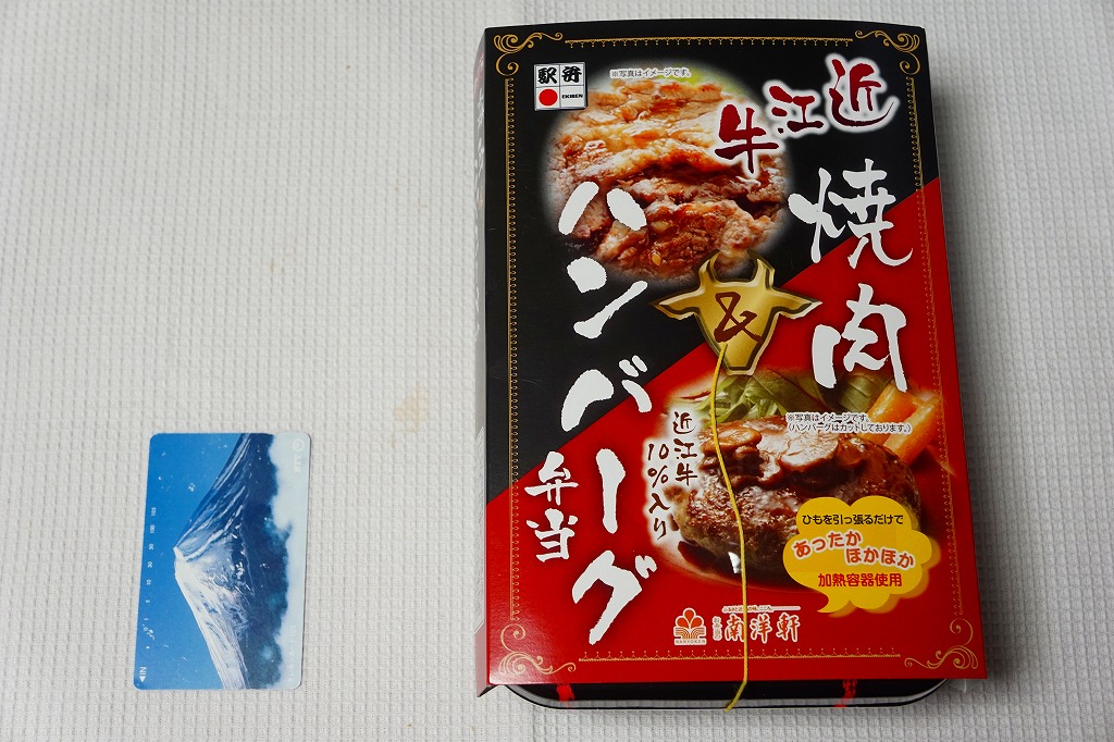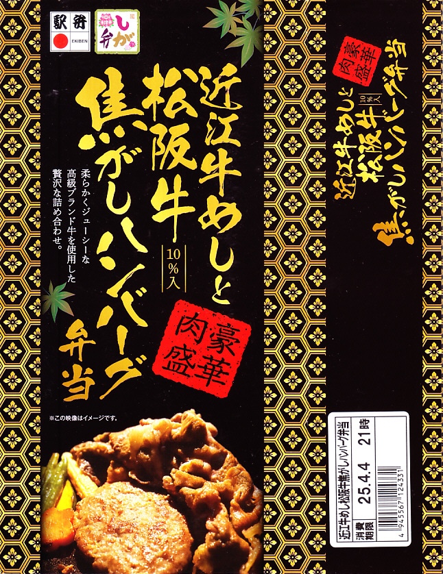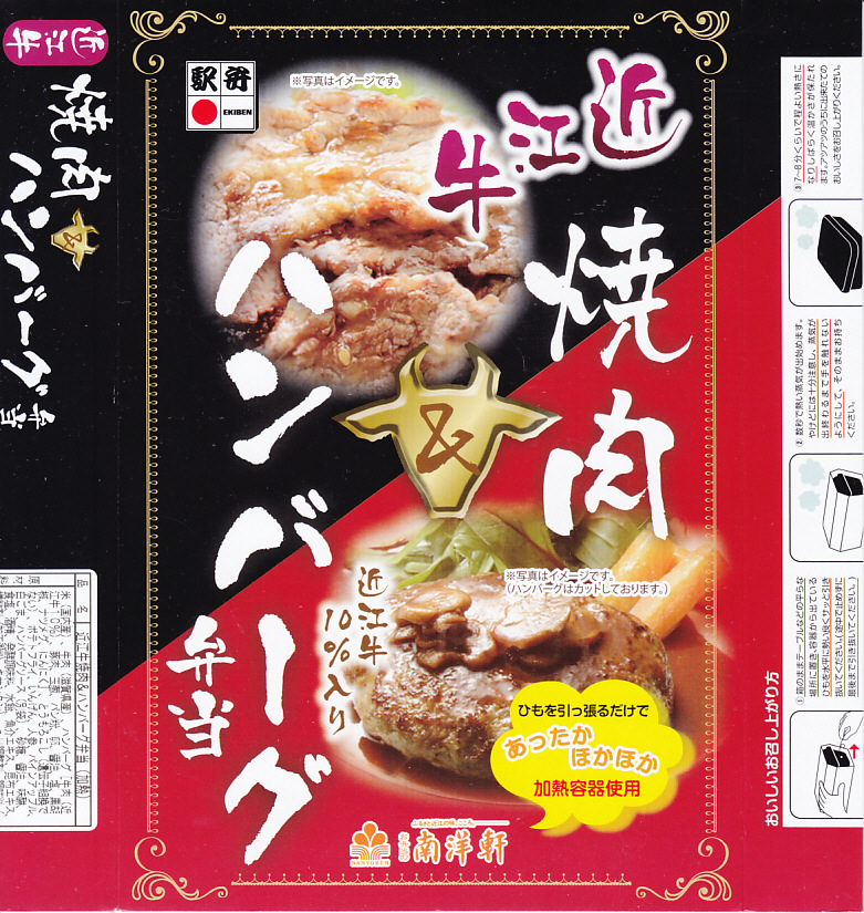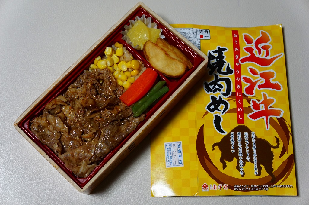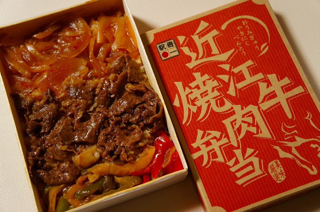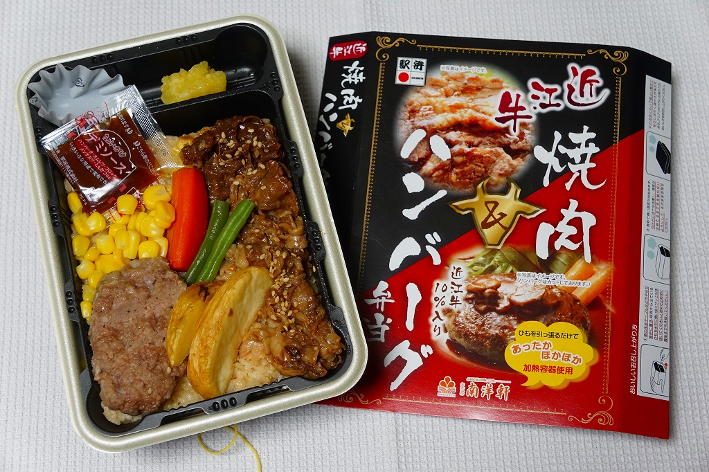 2014(平成26)年の秋頃の発売か。長方形の加熱機能付き容器に味付飯を詰め、近江牛の焼肉、近江牛を100%でなく10%入れたハンバーグ、ポテト、ニンジン、インゲン、コーンで覆う。味は下記のとおり少し前に京王百貨店の駅弁大会で買って食べた加熱式の草津駅弁と同じく良好。肉は少なくても、彩りが豊かで、各地の駅弁と並べるのに向く感じ。価格は2014年の発売時で1,300円、2023年時点で1,340円を経て1,480円、2025年時点で1,560円。