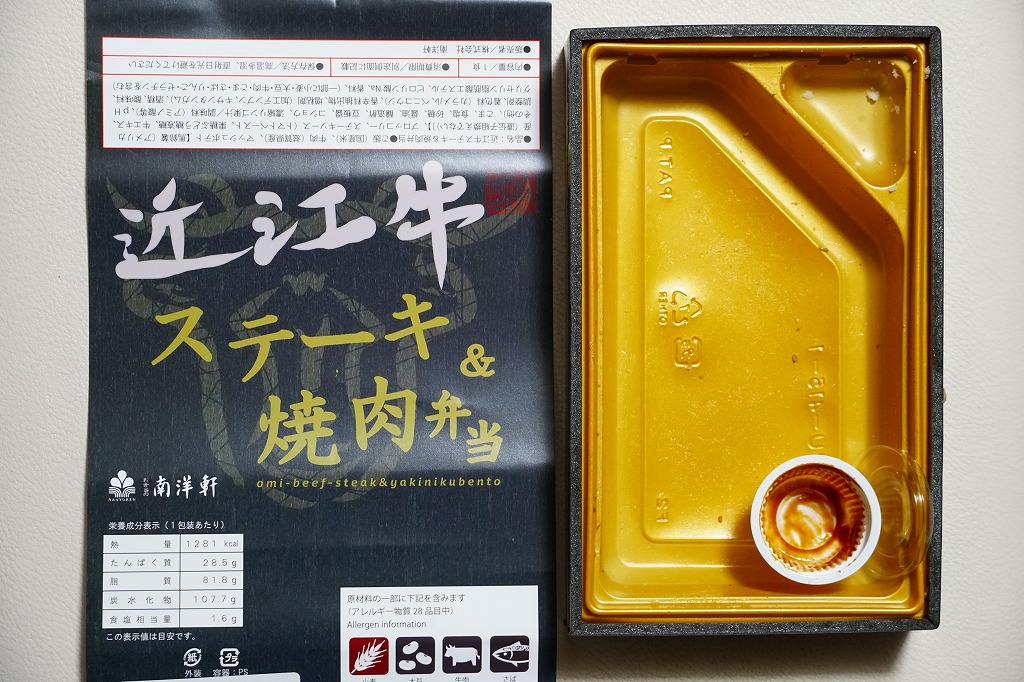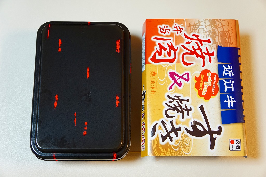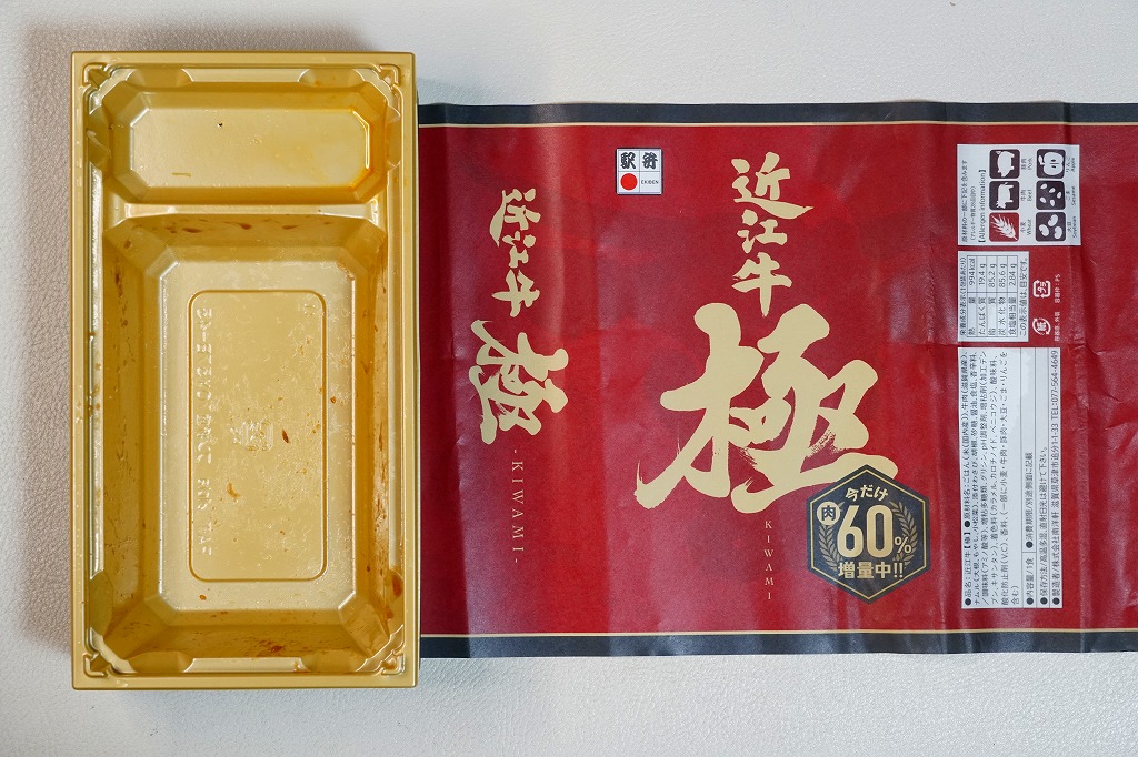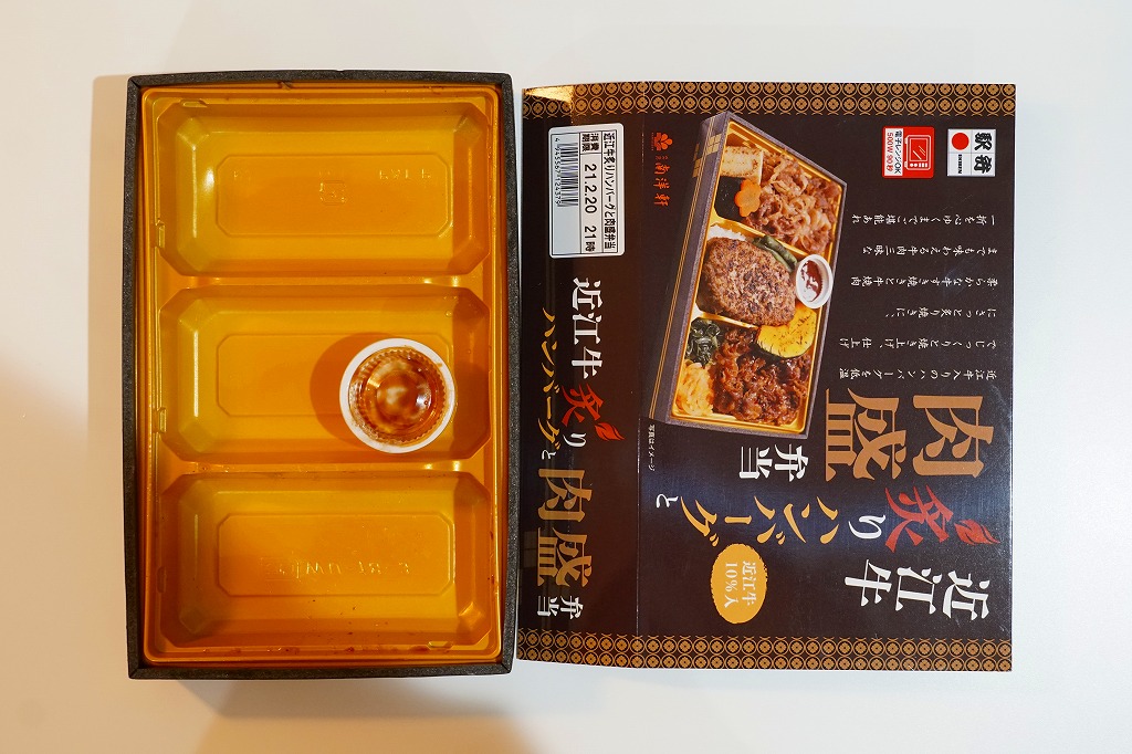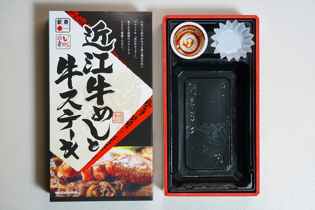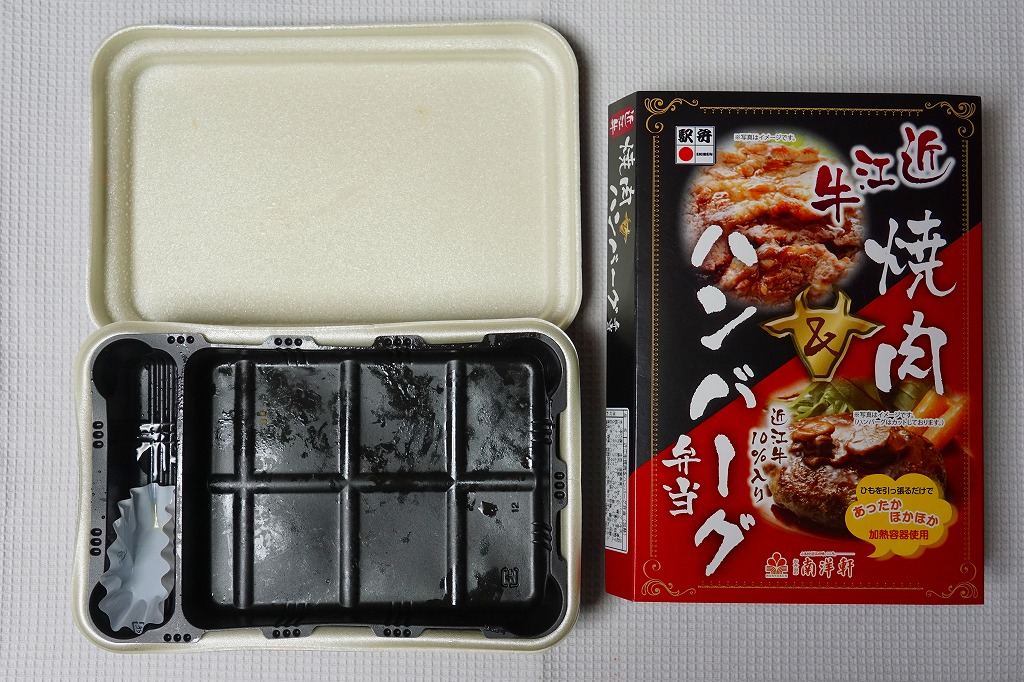 2014(平成26)年の秋頃の発売か。長方形の加熱機能付き容器に味付飯を詰め、近江牛の焼肉、近江牛を100%でなく10%入れたハンバーグ、ポテト、ニンジン、インゲン、コーンで覆う。味は下記のとおり少し前に京王百貨店の駅弁大会で買って食べた加熱式の草津駅弁と同じく良好。肉は少なくても、彩りが豊かで、各地の駅弁と並べるのに向く感じ。価格は2014年の発売時で1,300円、2023年時点で1,340円を経て1,480円、2025年時点で1,560円。