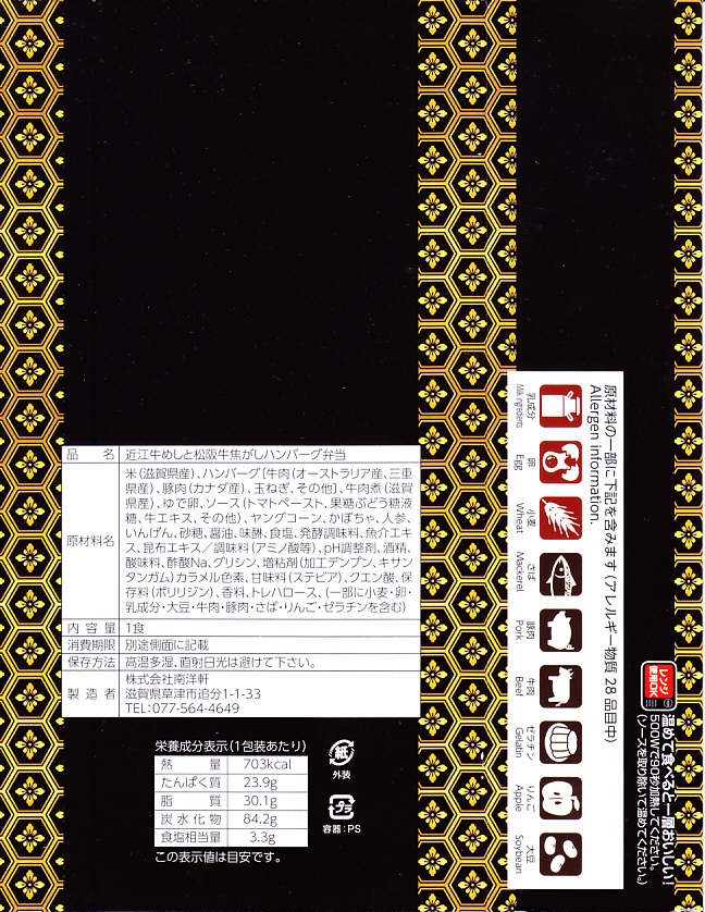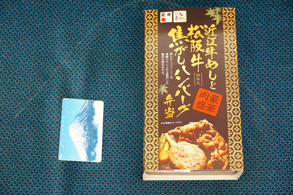 秋冬の駅弁大会シーズンに向けた、2020(令和2)年秋の新商品か。長方形の容器に茶飯を詰め、ハンバーグと牛肉煮、かぼちゃとにんじんとヤングコーンで覆い、ゆで卵とトマトソースを添える。タレに頼らないお肉たっぷりの、少しだけ洋食なお弁当。近江牛と松阪牛とは豪華な駅弁だと思う前に、スリーブの小さな文字と食品表示は、よく見ておいたほうがよいと思う。価格は2022年時点で1,290円、2025年時点で1,480円。