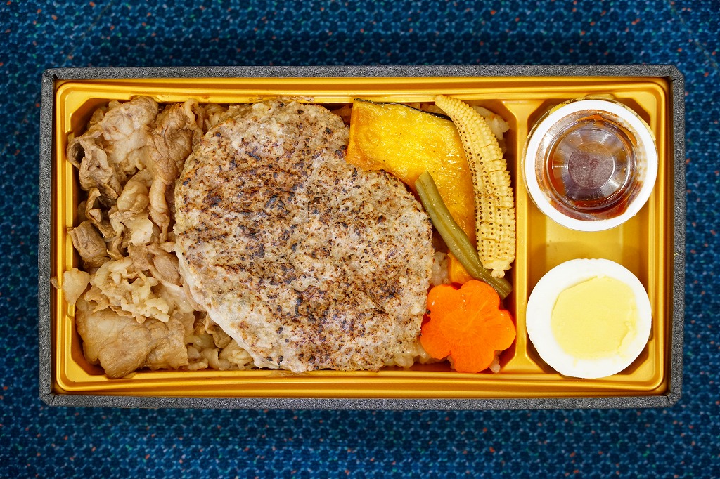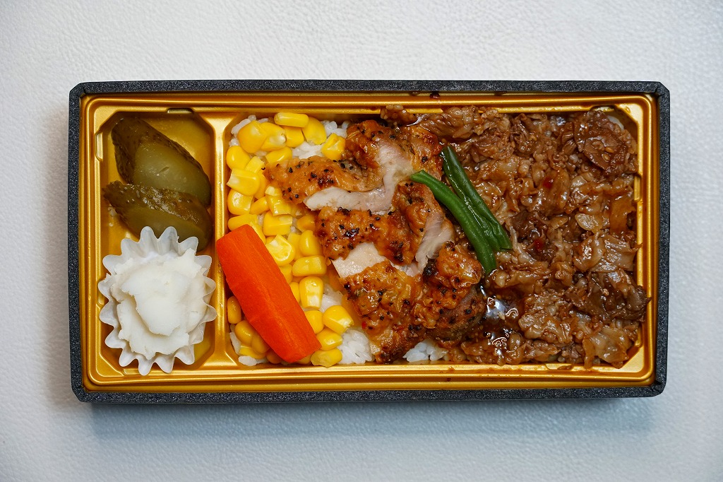 秋冬の駅弁大会シーズンに向けた、2021(令和3)年秋の新商品。中身のイメージイラストを載せたスリーブに収める長方形のプラ容器に、白飯を詰め、牛焼肉と鶏照焼、コーンとニンジンで覆い、ピクルスとマッシュポテトを添える。催事や輸送販売で他社の商品に見劣りしない名前と見栄えを、よく備えていると思う。このシーズンの半年間ほどの販売か。