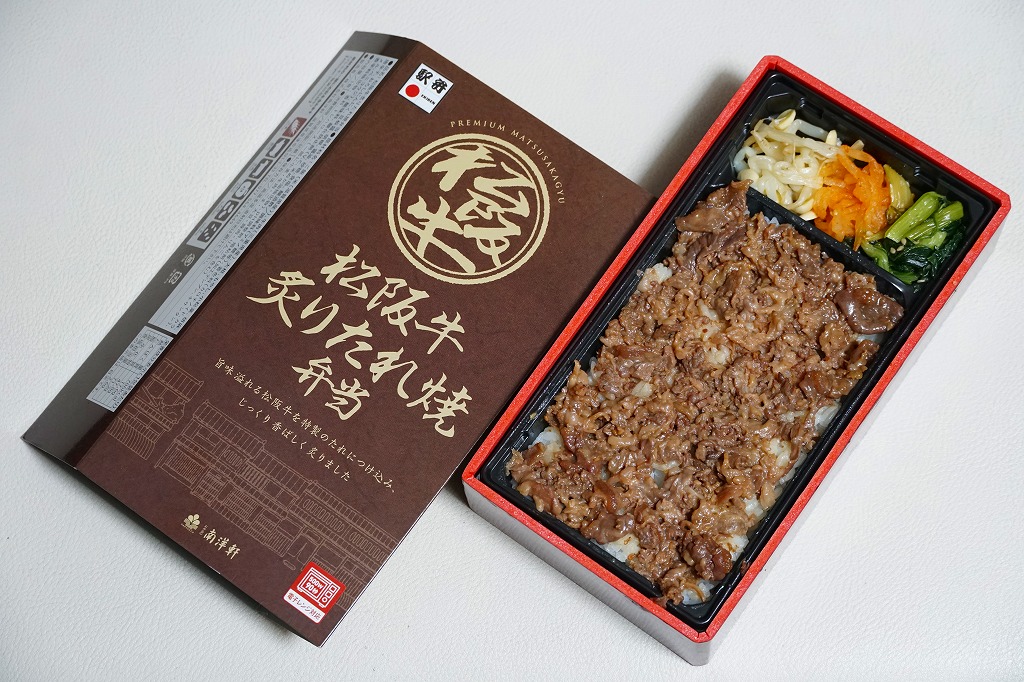 2022(令和4)年の2月までに、スーパーの駅弁催事などで発売か。長方形のプラ容器に白飯を詰め、松阪牛炙りたれ焼と商品名に書いてある牛肉で覆い、ナムルを添える。三重県松阪の牛肉で滋賀県草津の駅弁屋が弁当を作り、京都や大阪あるいは全国で販売することに違和感を覚えてはいけない、駅弁の今風な一形態。価格は2022年時点で1,340円、2023年時点で1,460円、2025年時点で1,540円。