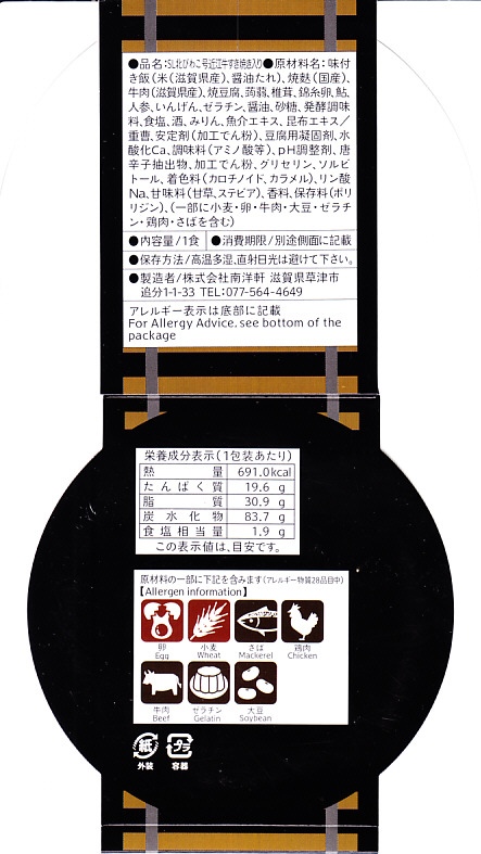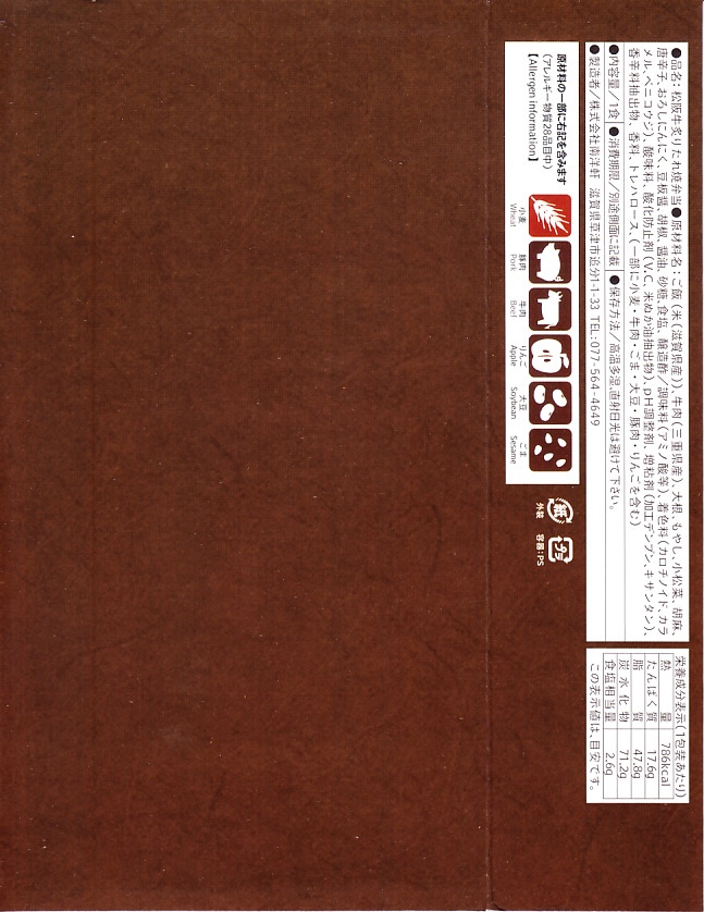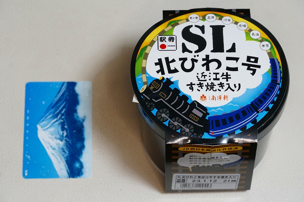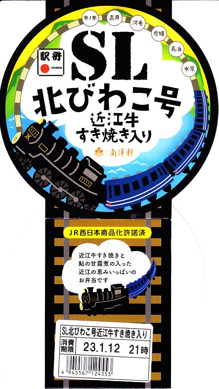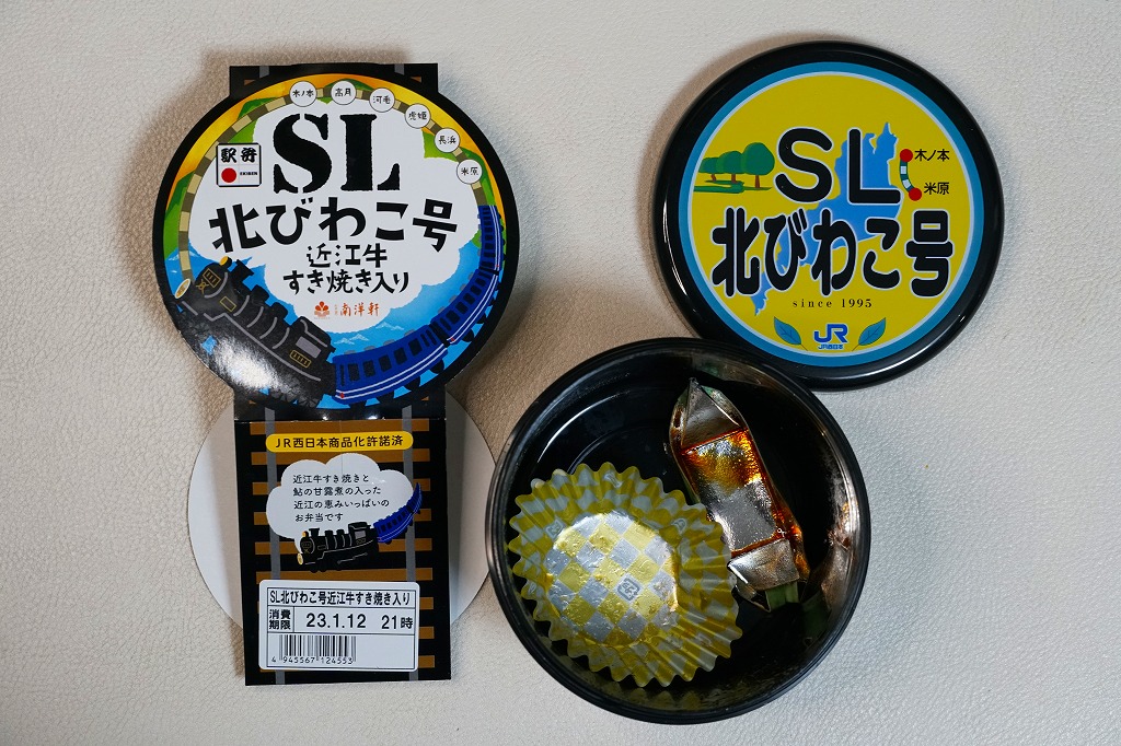 秋冬の駅弁大会シーズンに向けた、2022(令和4)年秋の新商品。容器である真っ黒なプラ製の筒は、水戸駅「奥久慈清流ライン号」や新潟駅「SLばんえつ物語」「SLばんえつ物語磐越西線めぐり」と同じもの。これに「SL北びわこ号」のヘッドマークの絵柄を印字し、その名前や汽車を描いたスリーブに収める。中身は味付き飯を近江牛のすき焼きで覆い、鮎の甘露煮を添えるもの。高額であるものの、地の物は入る印象。このシーズンの半年間で終売か。