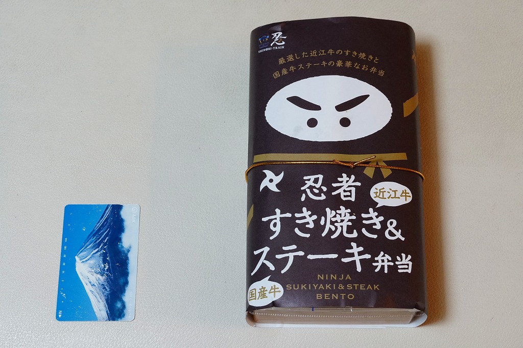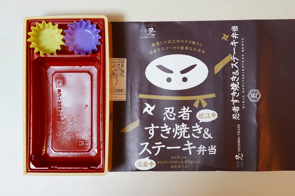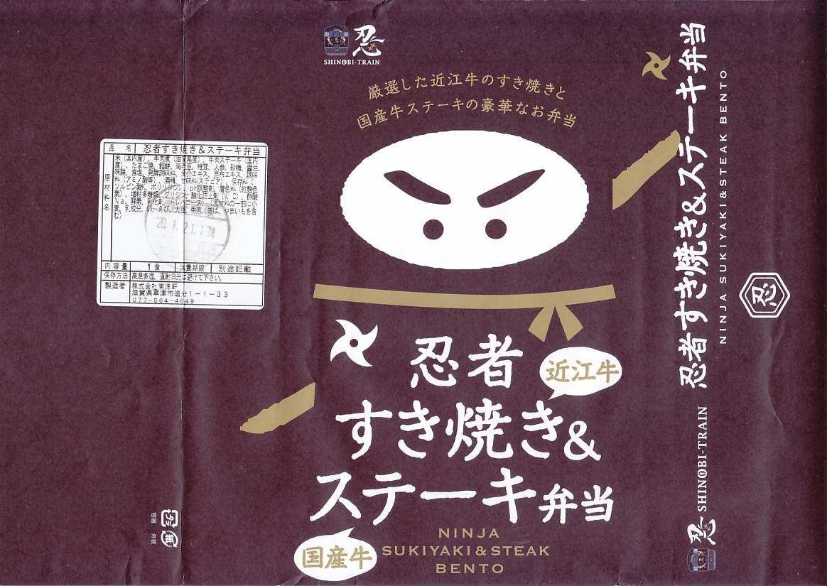 2020(令和2)年1月の京王百貨店の駅弁大会で、「忍者弁当」「忍者すき焼き弁当」とともに実演販売。茶色い掛紙には、2017(平成29)年2月発売の「忍者弁当」と同じ、忍者を思わせる構成のイラストが使われる。中身は白御飯を牛肉煮と牛ステーキで覆い、「忍」の焼き印を持つ玉子焼、手裏剣型のニンジン、しいたけ、煮豆、うばがもちを添えるもの。高価なりに肉の量があり、おいしかった。