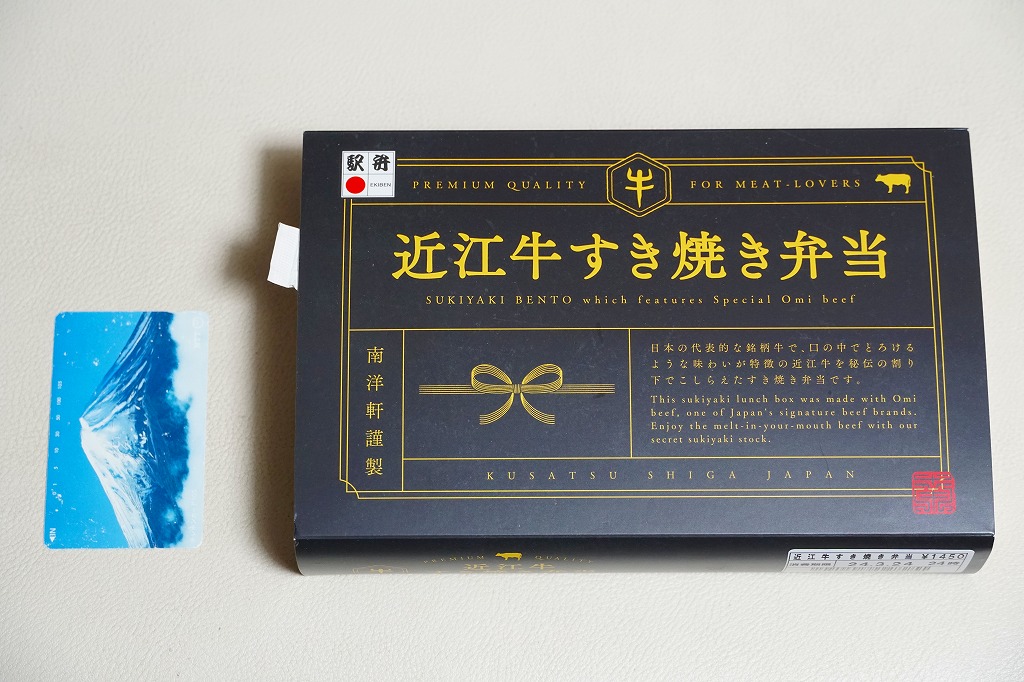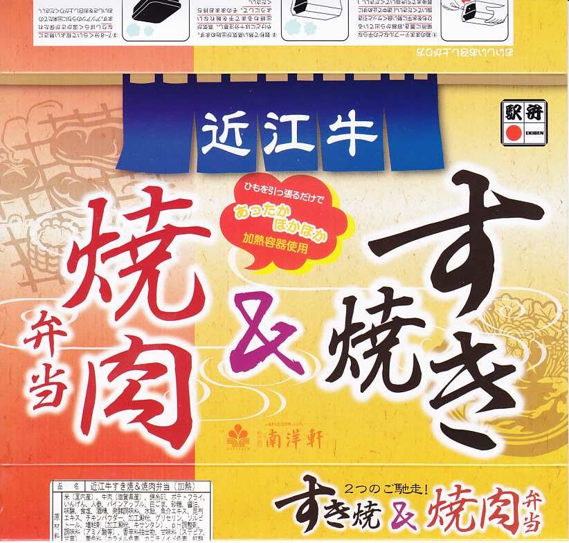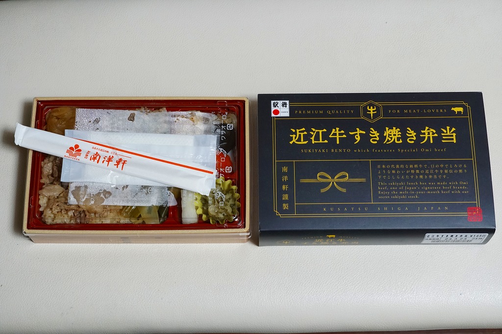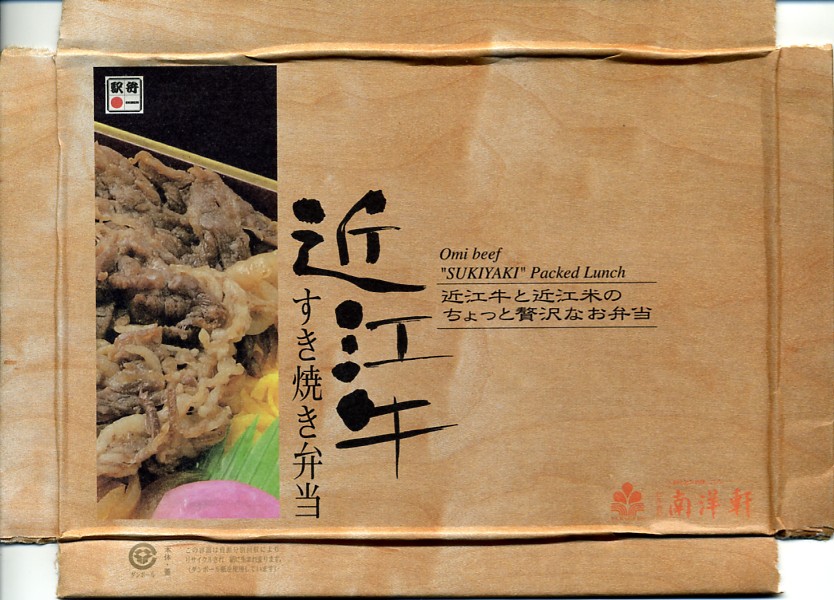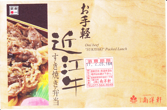2015(平成27)年1月の京王百貨店の駅弁大会や阪神百貨店の駅弁大会の頃までに発売された、駅弁大会専用商品か。長方形の加熱機能付き容器に御飯を詰め、近江牛のすき焼きと焼き肉で覆い、錦糸卵とニンジンとインゲンで仕切り、ポテトフライとパイナップルを添える。他の草津駅の牛肉駅弁と同じく、真っ黒で濃くて甘いビーフの風味。価格は発売時や2016年の購入時で1,500円、2020年時点で1,580円、2023年時点で1,650円、2024年時点で1,900円。