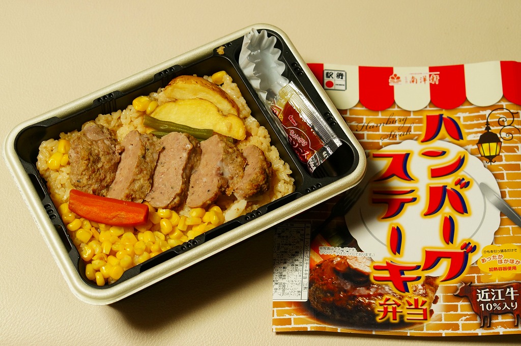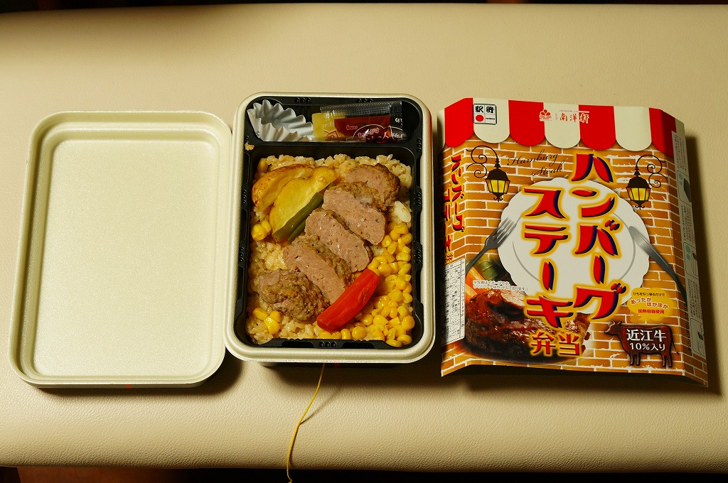 秋冬の駅弁大会シーズンに向けた、2014(平成26)年秋の新商品か。駅弁では意外に少ない、ハンバーグ弁当。長方形の加熱機能付き容器に茶飯を詰め、牛肉ハンバーグのスライスを並べ、コーンとニンジンとインゲンとフライドポテトで彩り、パイナップルとデミソースを添える。「近江牛10%入り」の棒ハンバーグを含め、えらくあっさり、さっくりした風味で、ソースの味も薄く、どこにも書いてないがヘルシーな印象を受けた。2018年秋冬のシーズンまでの販売か。
