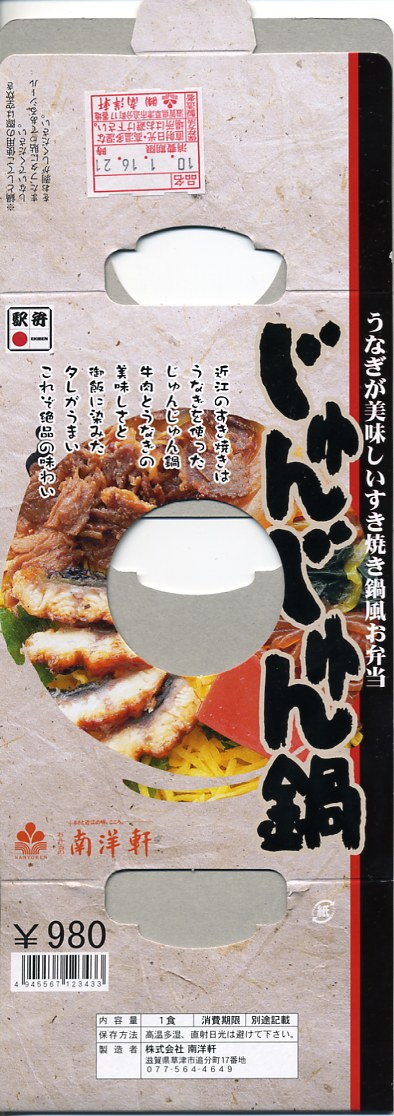 秋冬の駅弁大会シーズンに向けた、2009(平成21)年秋の新商品か。昭和の頃の鍋駅弁と違い、そのままミニミニ鍋料理に使えそうな土鍋を容器に使用、これを中身のイメージ写真や駅弁の名前を印刷したボール紙の帯で留める。中身は茶飯の上を錦糸卵、牛すき焼き肉、糸こんにゃく、長ネギ煮で覆い、三つ葉とウナギと赤こんにゃくを添えるもの。2012年頃までの販売か。