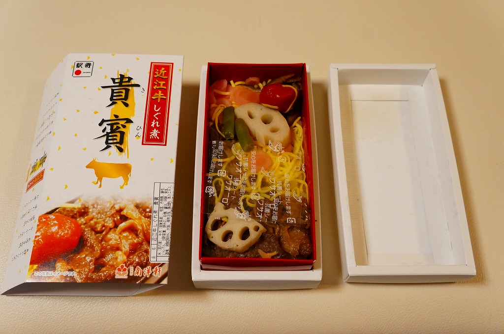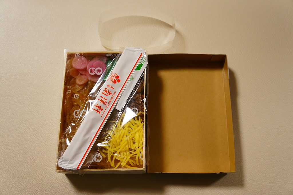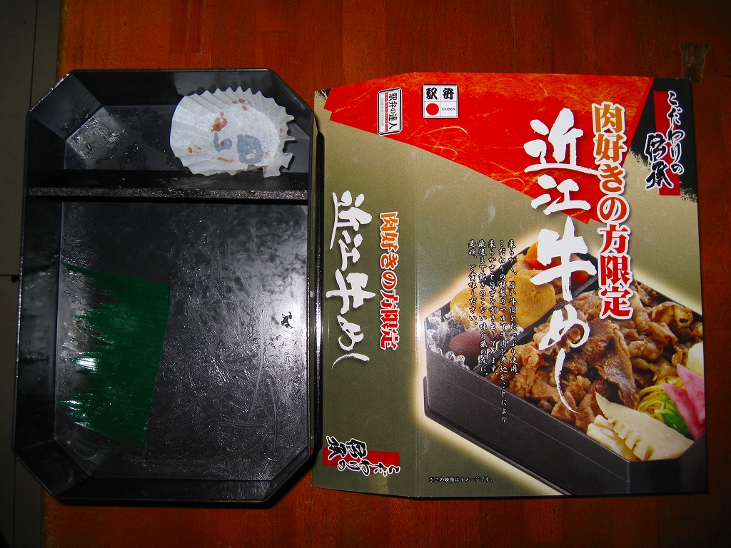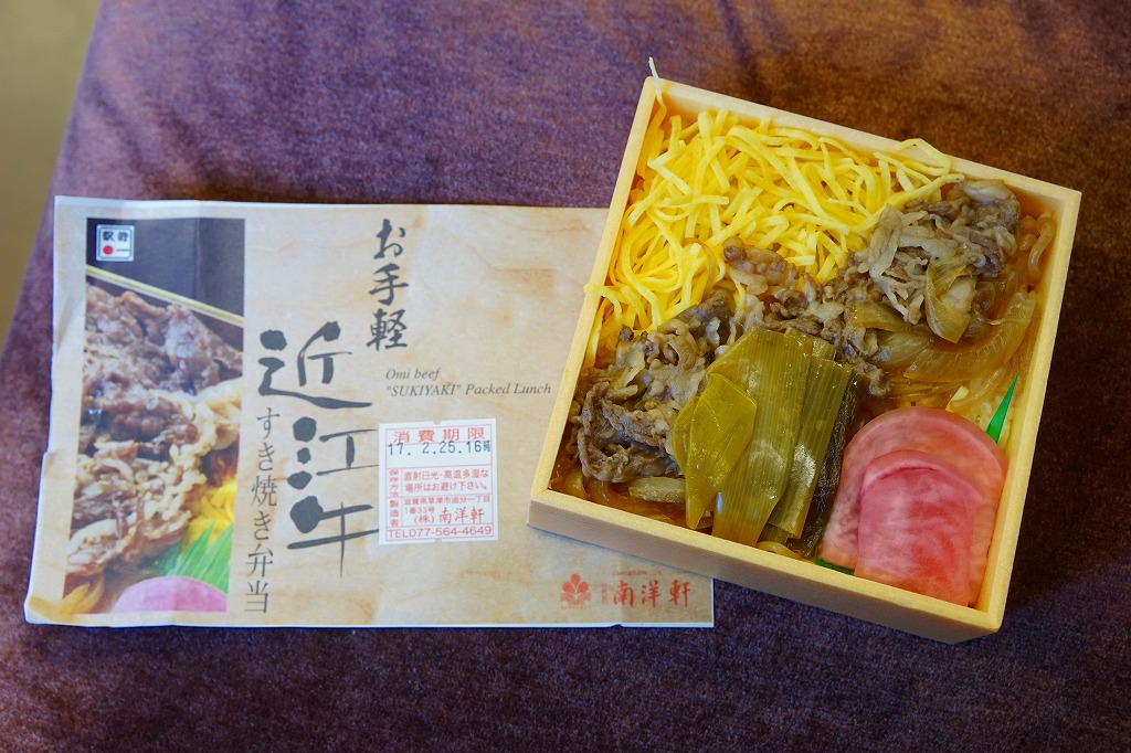 中身はつまり、近江牛すき焼き弁当。御飯を牛肉煮、糸こんにゃく、錦糸卵で覆い、タマネギ煮、青葱煮、日野菜漬を添える。肉の脂身が少なめで赤身が多めであること以外は、いつもの草津駅弁、あるいは京都駅や新大阪駅や駅弁大会の弁当と、同じような味がする。