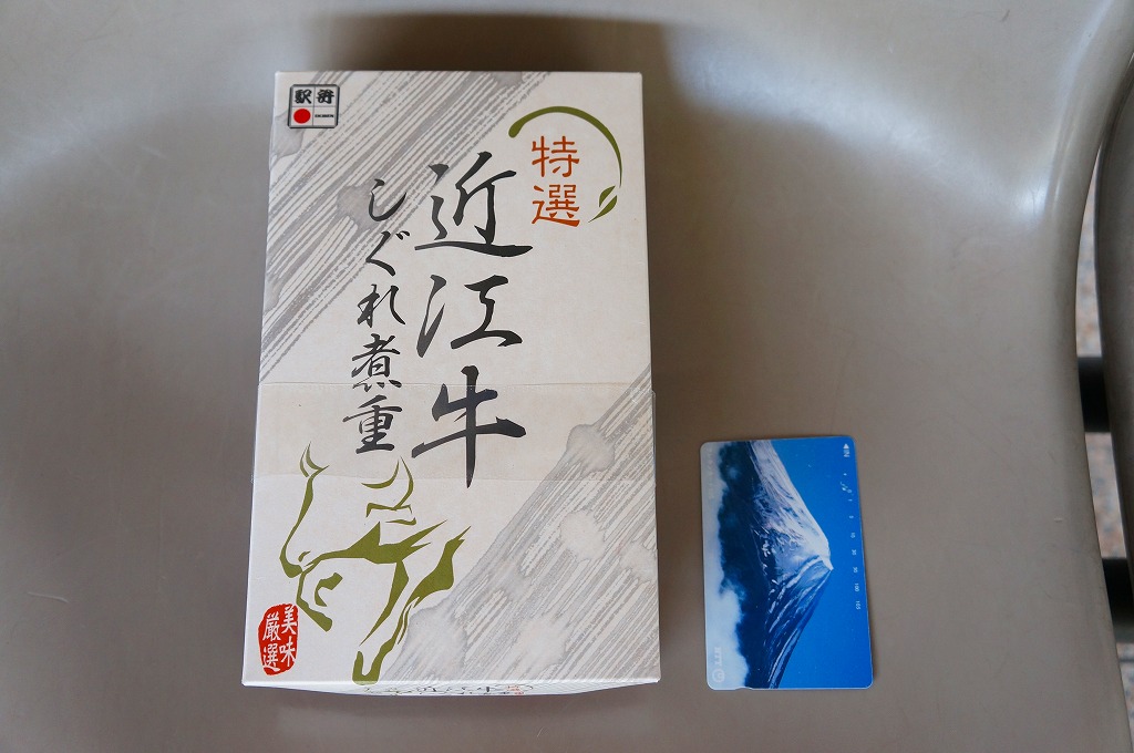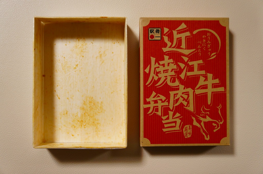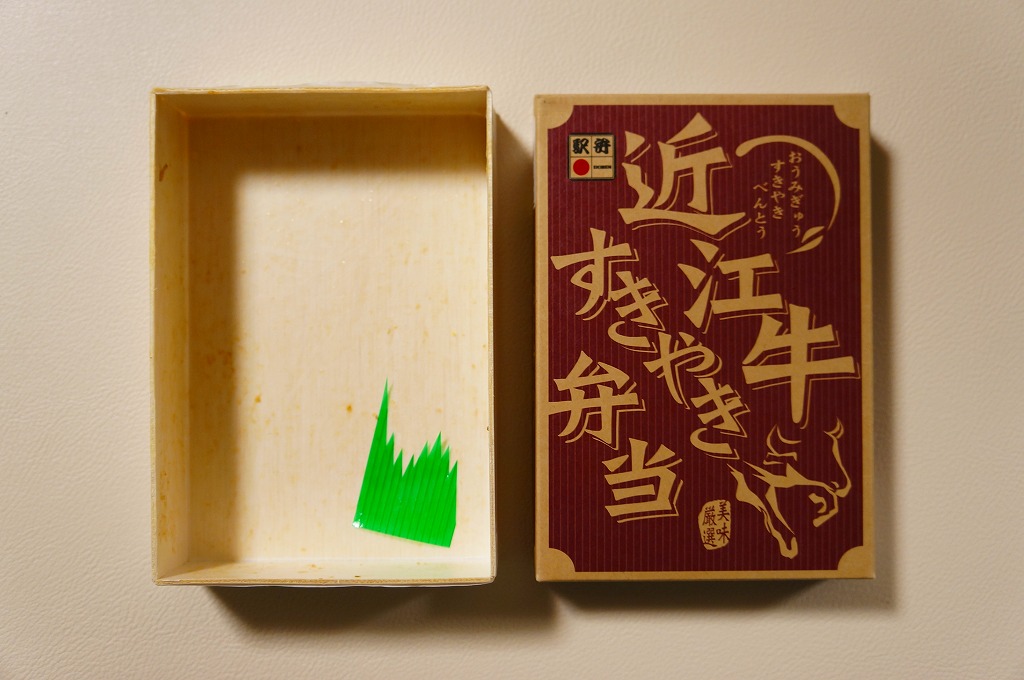 見た目と質感と固さが木のようなボール紙製の容器に御飯を敷き、近江牛しぐれ煮と錦糸卵で覆い、ダイコンや鶏肉などの煮物と日野菜漬などを添えるもの。とても甘く味付けされた薄く色濃く少量の牛肉は上品な感じ。草津駅でもきっと予約販売が実施されているはず。2015年頃までに東京駅での販売はなくなったようだが、新大阪駅の駅弁売店「旅弁当にぎわい」で時々、実演販売をしている模様。価格は2012年の購入時で1,470円、2018年4月には1,500円で販売。2020年までの販売か。
