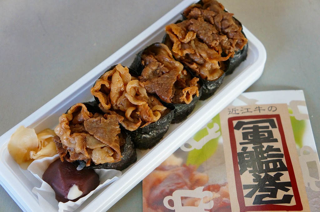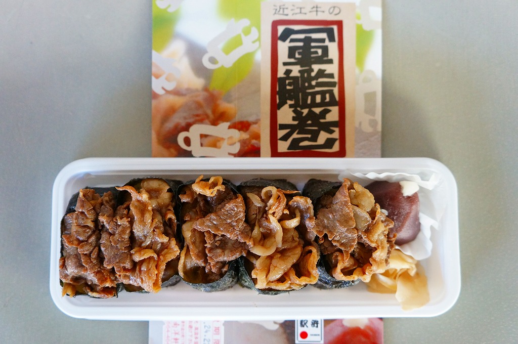 東京駅の駅弁売店「駅弁屋 祭」で販売するために、この売店の開店日である2012(平成24)年8月7日に東京駅でデビューか。「近江牛焼肉弁当」(980円)「近江牛すきやき弁当」(1,050円)とこの「近江牛軍艦巻」(980円)と「近江牛三昧」(1,400円)「近江牛しぐれ煮重」(1,470円)の5種が毎日、170種類以上の駅弁を備えるというこの大きな駅弁売店で販売されるようになった。