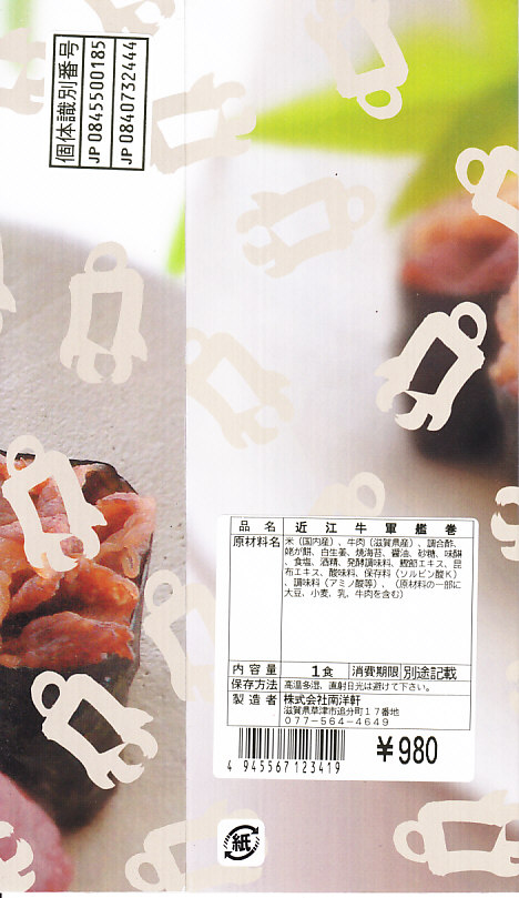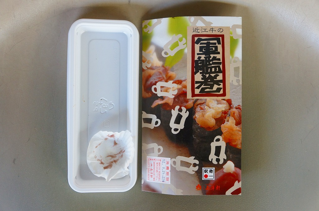 小さくとても細長い惣菜向けプラ容器に、白御飯に牛肉煮を載せて海苔を巻いた軍艦巻が5個並び、うばがもちと生姜が添えられる。草津駅弁はその名のとおり、牛すき焼き肉の軍艦巻が5カン。下記のとおり同じ売店で同じような牛肉駅弁を食べ続けていたので、相変わらずの近江牛を含め海苔や酢飯にも味に関して感想はなく、一方で草津宿や駅弁屋と深い関係にある「うばがもち」を1個詰めていることが最大のセールスポイントではないかと思った。価格は2012年の発売時や購入時で980円、2014年4月の消費税率改定で1,010円。2018年頃までの販売か。