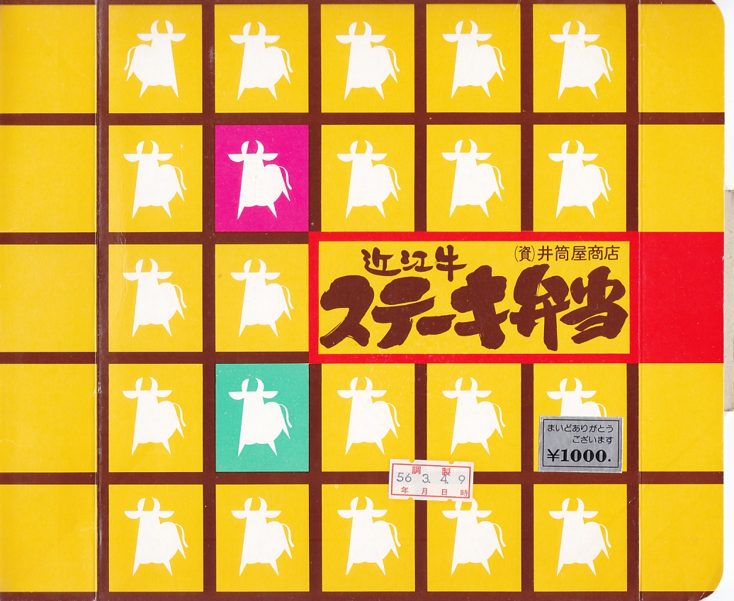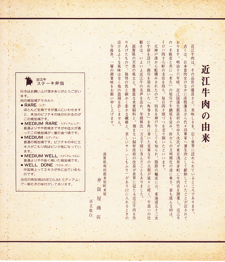 1981(昭和56)年3月4日9時の調製と思われる、昔の米原駅弁の紙箱。ふたの裏面に、近江牛肉の由来と、肉の焼加減アラカルトを記す。