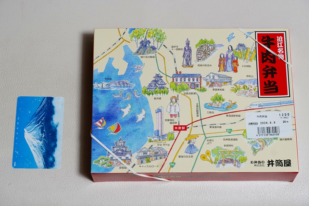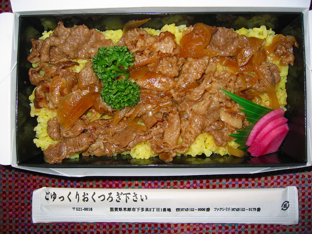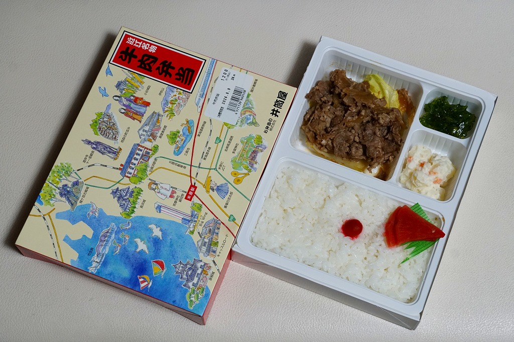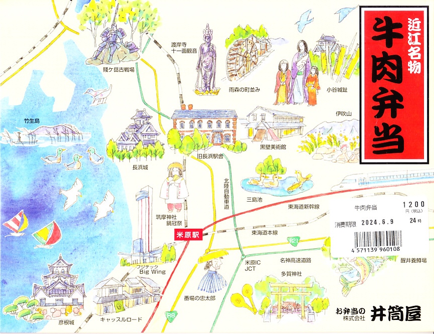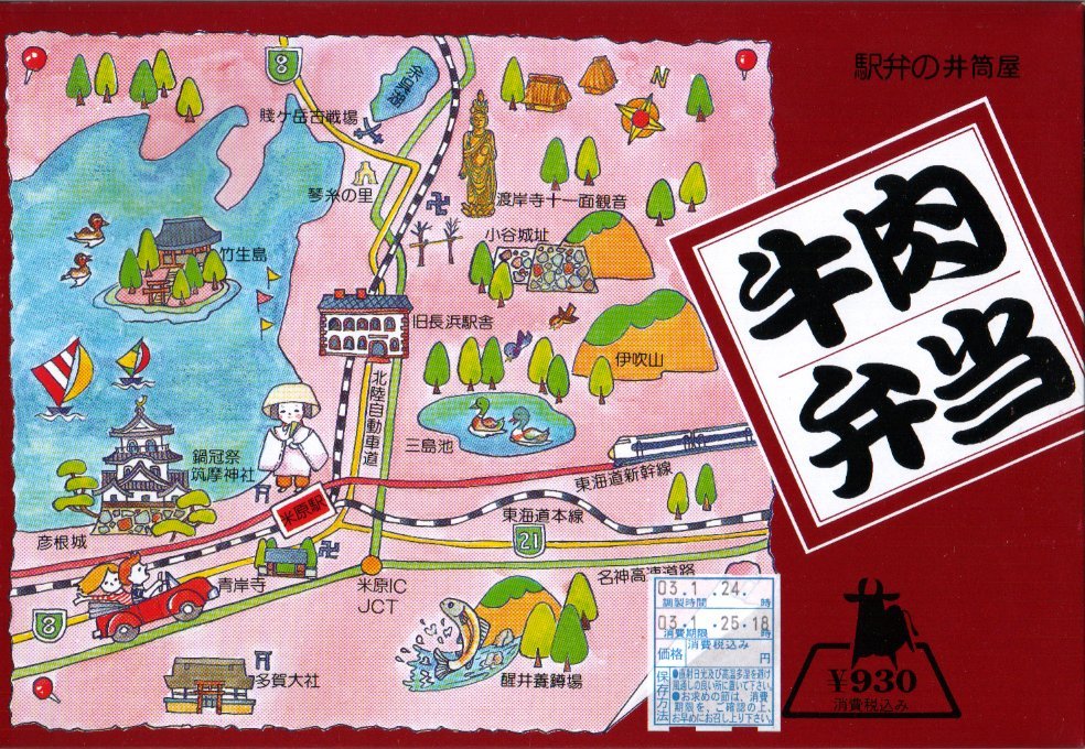 1980年代の発売か。米原付近のイラストマップを描いたボール紙の容器を使う。白いプラ製トレーに詰めた中身は、日の丸御飯に赤かぶ漬を添え、レタスを敷いて玉ねぎ入り牛肉炒めを載せ、ポテトサラダとしそわかめを添えるもの。個々の食材はおいしいと思うけれど、見た目にやや寂しい牛肉弁当。価格は2003年時点で930円、2006年10月から950円、2014年時点で1,000円、2023年時点で1,150円、2024年時点で1,200円、10月から1,280円。調製元の駅弁事業からの撤退により、2025年2月末までの販売。
