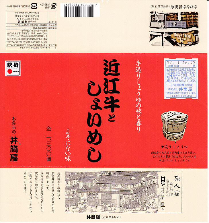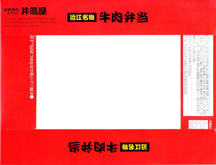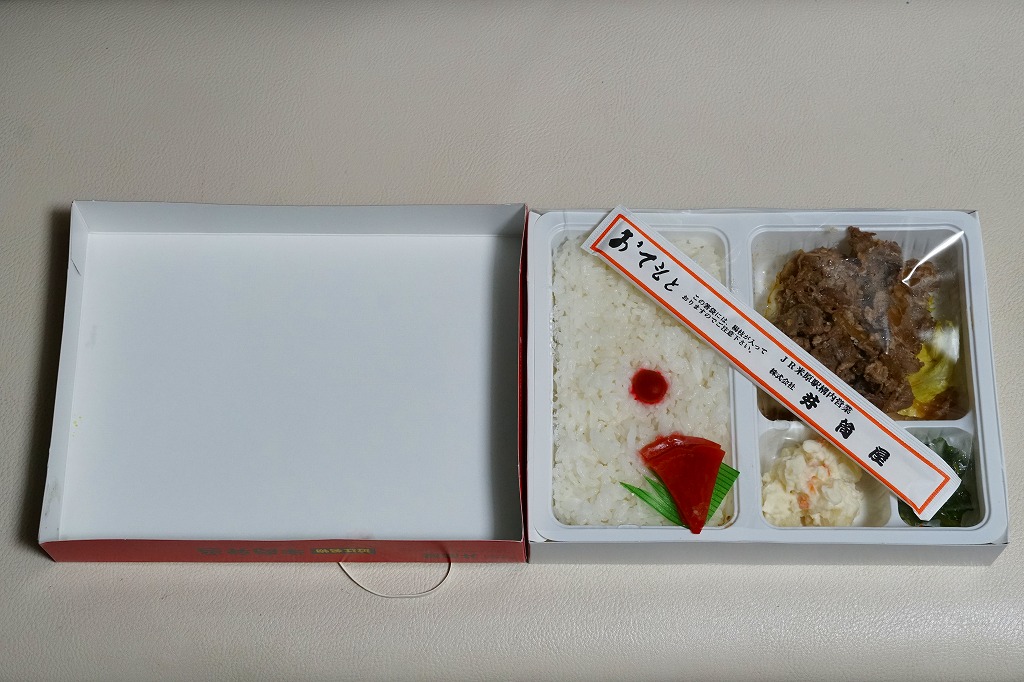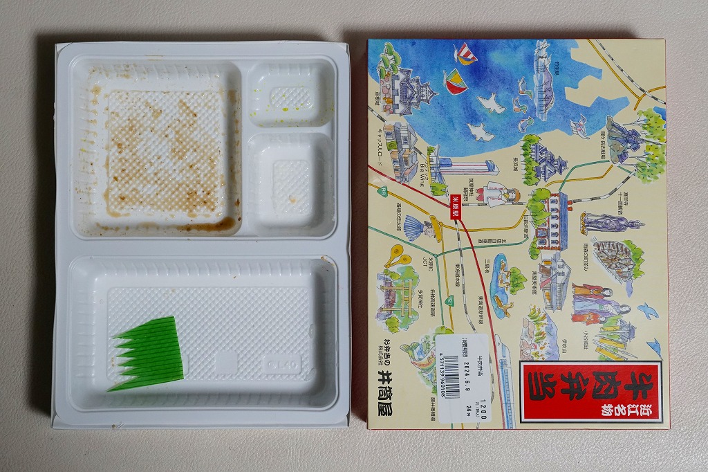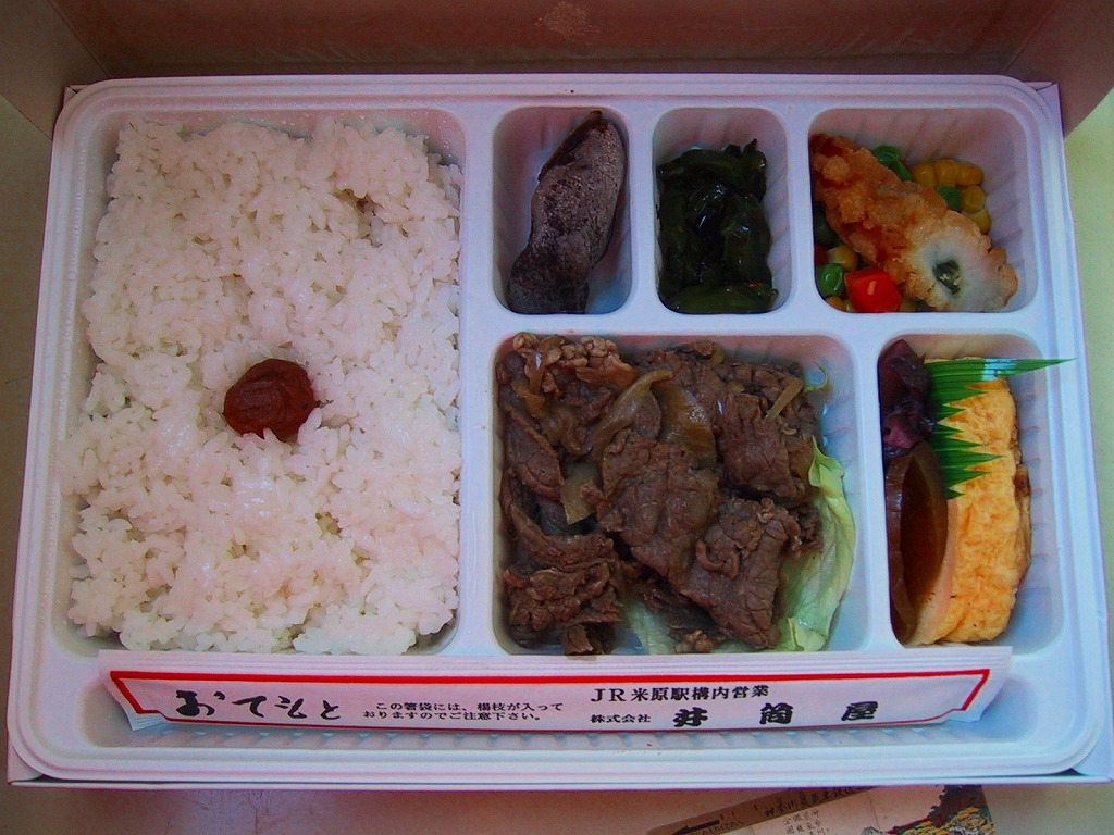 1980年代の発売か。米原付近のイラストマップを描いたボール紙の容器を使う。白いプラ製トレーに詰めた中身は、日の丸御飯に赤かぶ漬を添え、レタスを敷いて玉ねぎ入り牛肉炒めを載せ、ポテトサラダとしそわかめを添えるもの。個々の食材はおいしいと思うけれど、見た目にやや寂しい牛肉弁当。価格は2003年時点で930円、2006年10月から950円、2014年時点で1,000円、2023年時点で1,150円、2024年時点で1,200円、10月から1,280円。調製元の駅弁事業からの撤退により、2025年2月末までの販売。