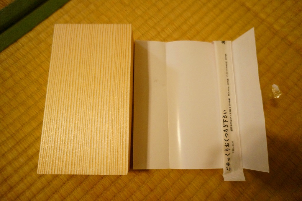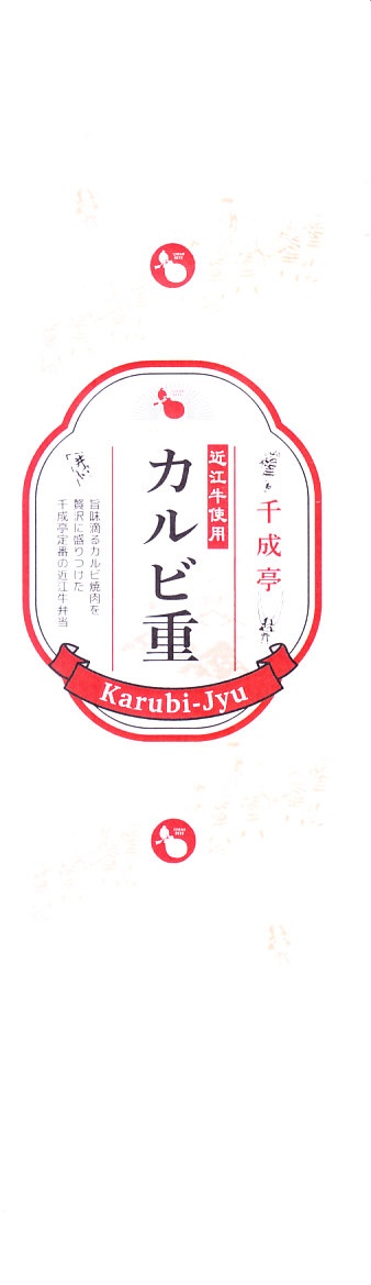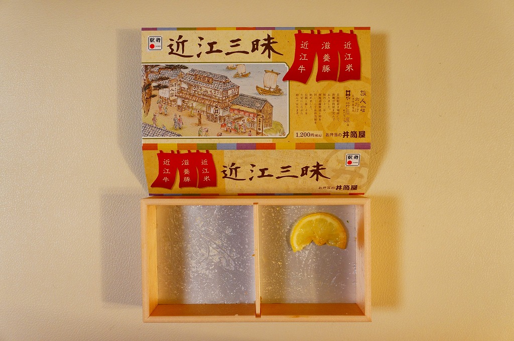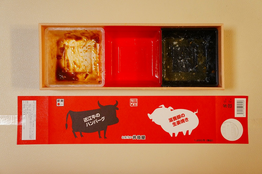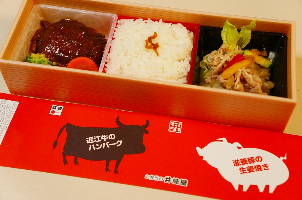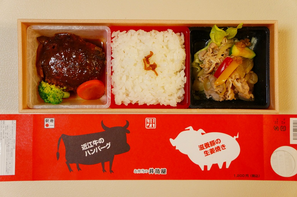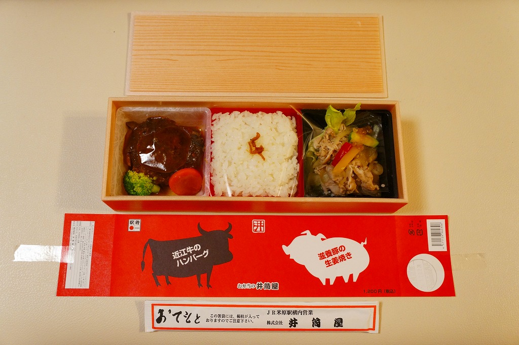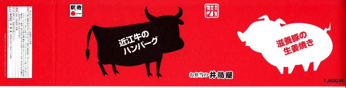 京王百貨店の駅弁大会での実演販売のために、2014(平成26)年1月に催事場でデビューか。細長い容器なのに、掛紙は長手の方向にかけている。中身は正方形3区画分で、左に近江牛のハンバーグ、中央に白御飯、右に滋養豚(じようとん)の生姜焼き、というかすき焼き肉タイプの生姜煮を詰める。少量なのに高価だと言われそうだが、味も形もきれいで確か。催事の終了後も販売されたようだが、年内で終売か。
