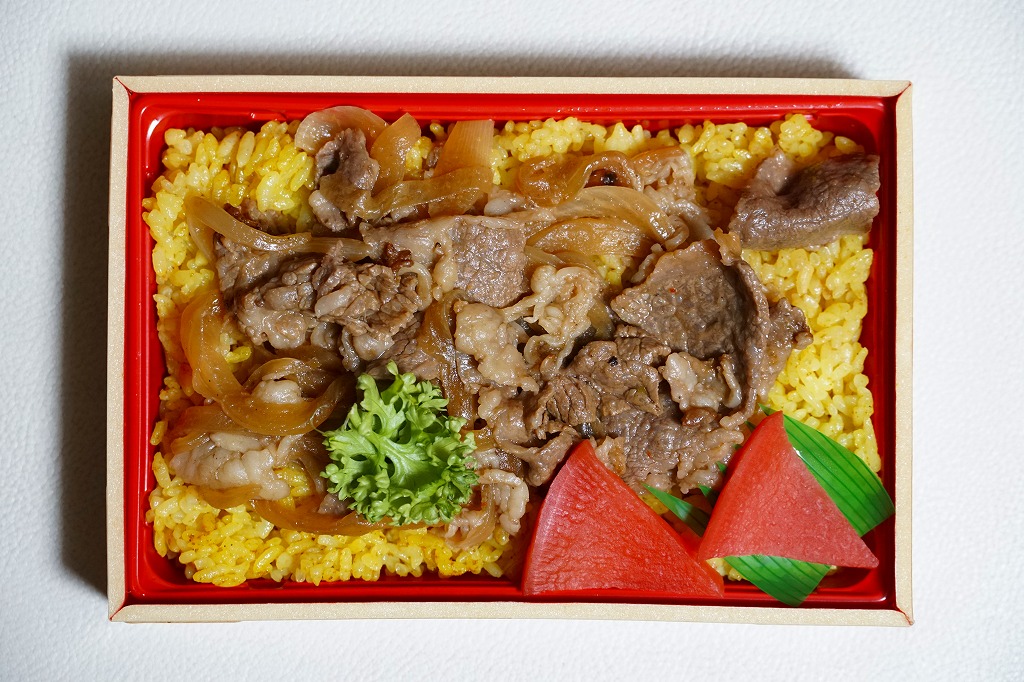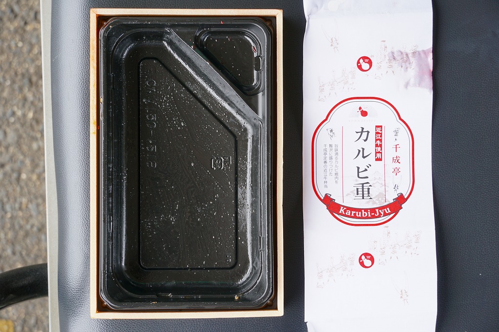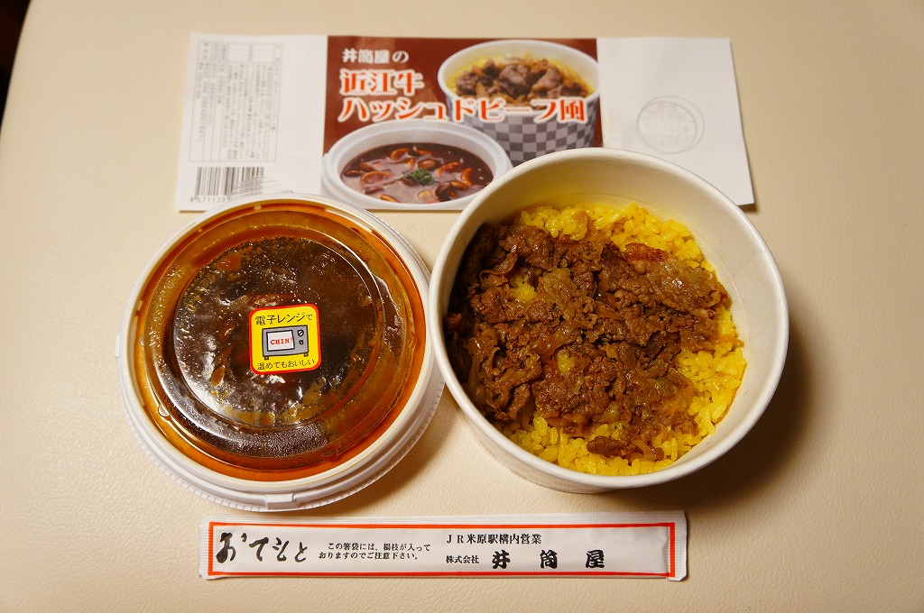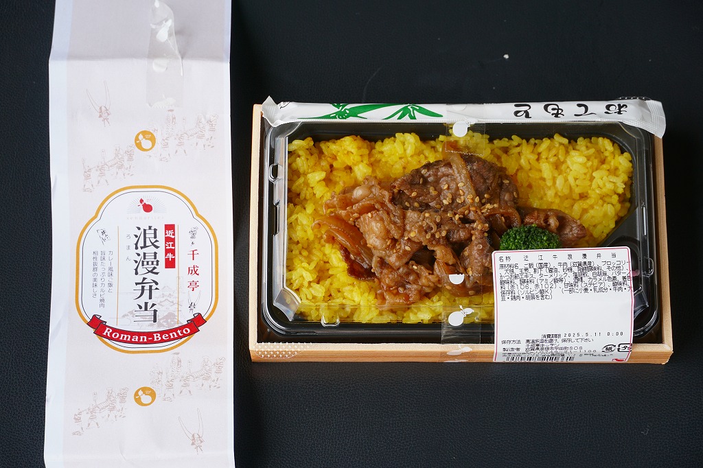 デパ地下弁当かスーパーの惣菜向けのプラ容器に、商品名を記した紙帯を巻く。中身はカレー風味の黄色い御飯の上に、牛カルビ焼肉を置き、白ごまを振り、ブロッコリーと大根桜漬を添えるもの。この内容と風味は、入れ替わりに消えたかつての米原駅弁「近江牛大入飯」を思わせる。はたしてこれが、米原駅弁と呼ばれる存在になるのかどうか。