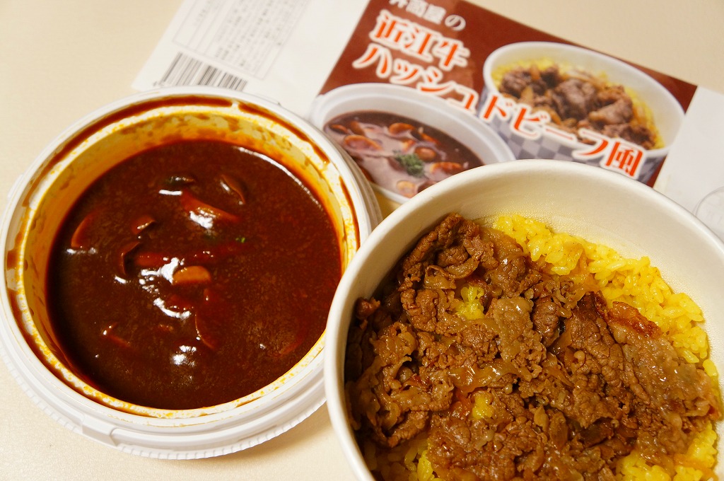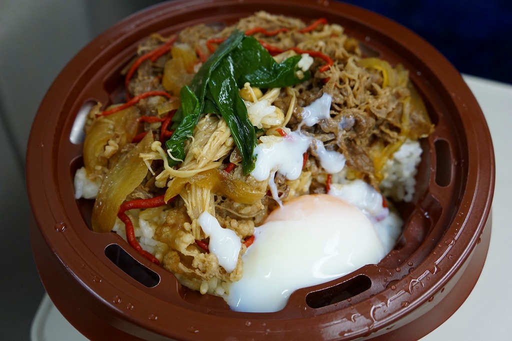 2015(平成27)年秋の新作か。円形の加熱機能付き容器に白御飯を敷き、エノキとタマネギと赤い糸こんにゃくをたっぷり混ぜた牛肉煮で覆い、青ネギで彩り、温泉卵を別添する。