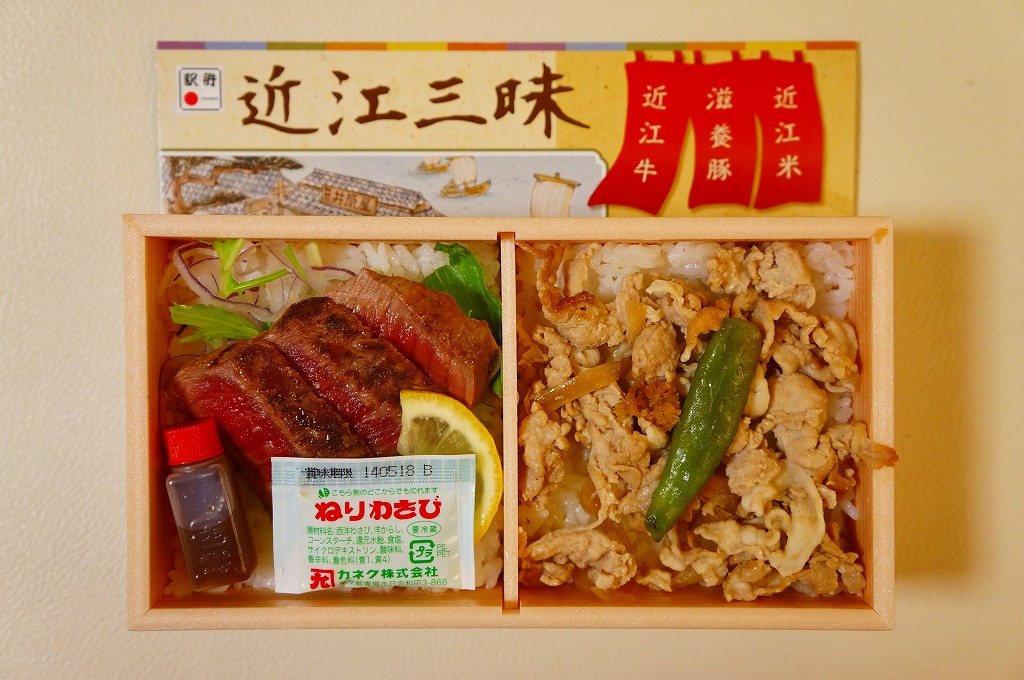 2014(平成26)年1月の阪神百貨店の駅弁大会でのみ売られた疑義駅弁。近江米を使う、近江牛のステーキ丼と、滋養豚の豚丼の詰合せ。つまり、2012(平成24)年1月の京王百貨店の駅弁大会でデビューした「近江牛しょいめし」の、醤油飯の牛飯を白飯の豚飯に入れ替えたもの。催事場での大量実演販売の弊害か、そういう商品設計になっているのか、豚が固くて薄味が過ぎて、その風味はなかった。