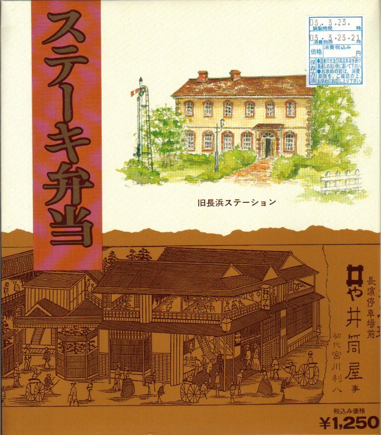 2003(平成15)年3月23日に購入した、米原駅弁の紙箱。絵柄も中身も、上記の駅弁「ステーキ弁当」と同じ。当時の価格は1,250円だった。
