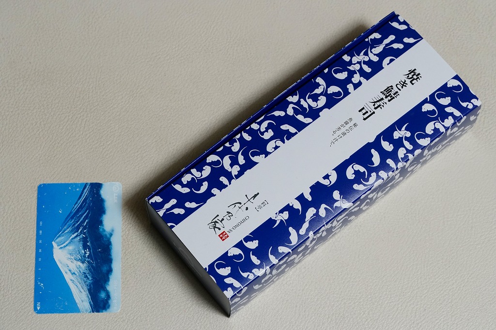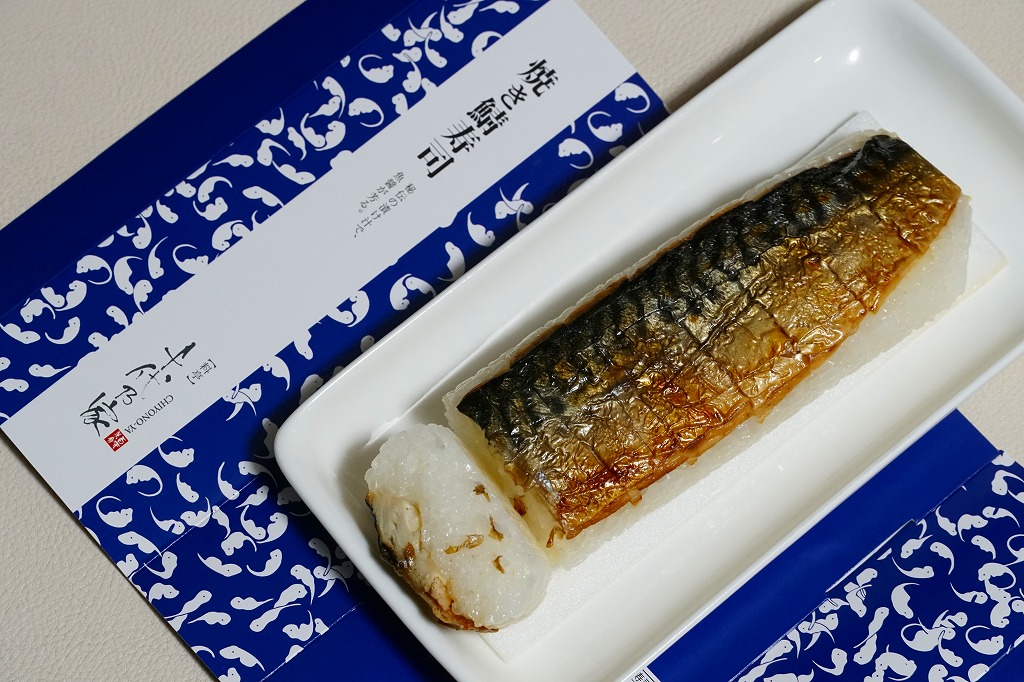 天橋立駅の売店で買えた惣菜。商品名のとおり、酢飯に焼きサバを貼り合わせた棒寿司が1本、フィルム包装で密封され、青い紙箱に収まる。値段も分量もコンパクトな、普通においしい焼きサバ寿司。駅では茶色い箱の「牛肉いなり寿司」(920円)と、黄色い箱の「丹後ばら寿司いなり」(830円)も販売するらしいが、いずれも駅弁と名乗ったり紹介されたことは、ないと思う。調製元は京丹後大宮駅と峰山駅の間の国道沿いで料亭「千代乃家」の仕出し部門と紹介する仕出し弁当店。