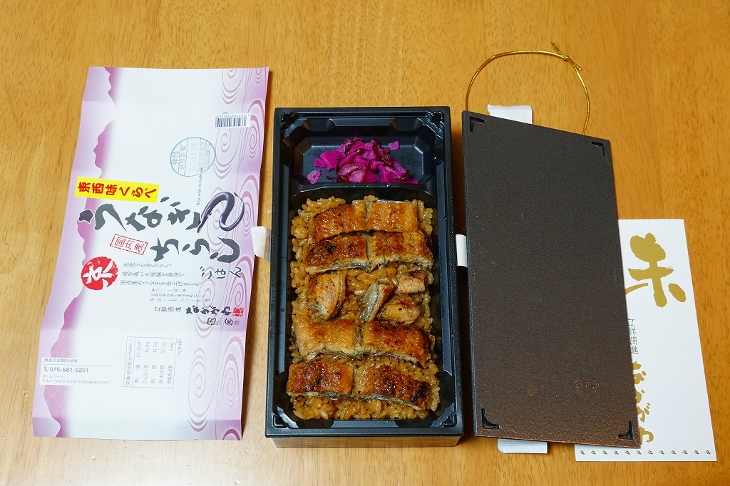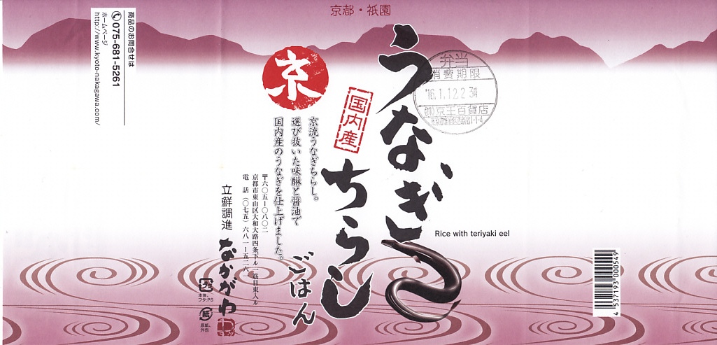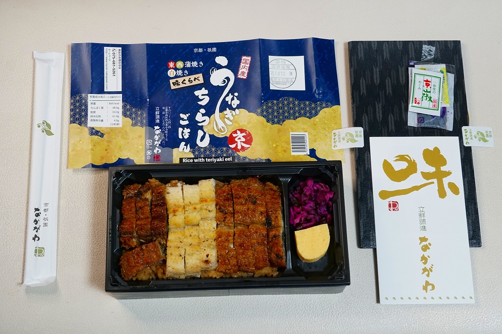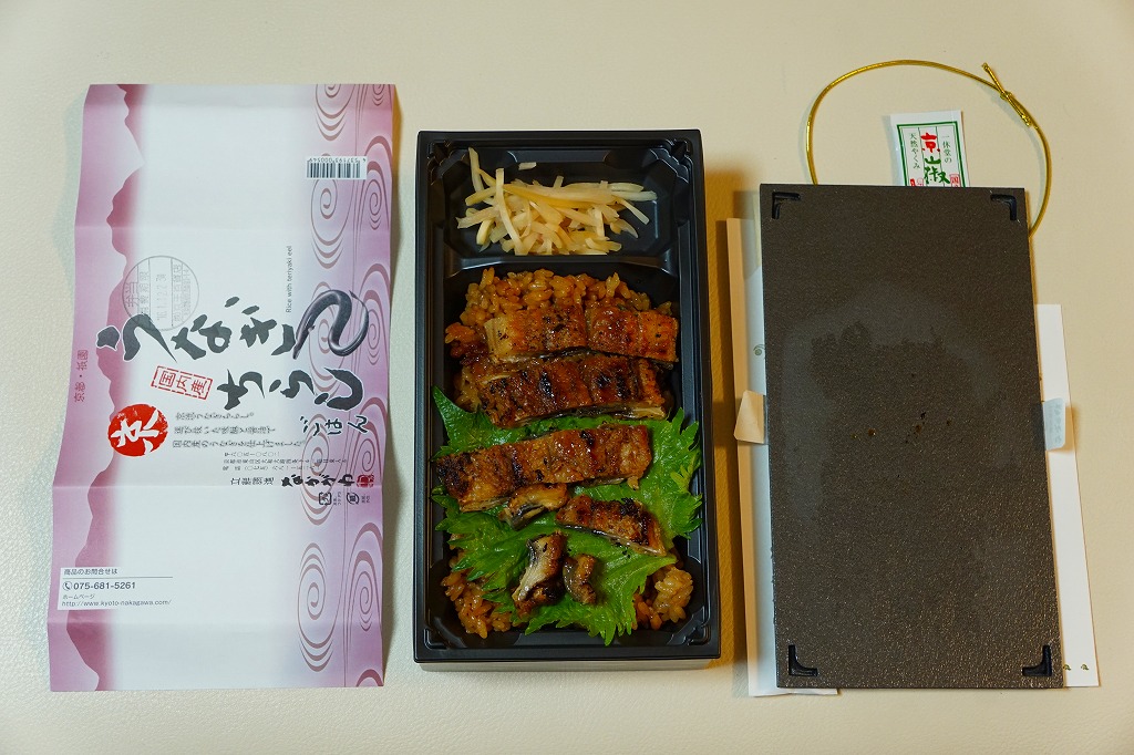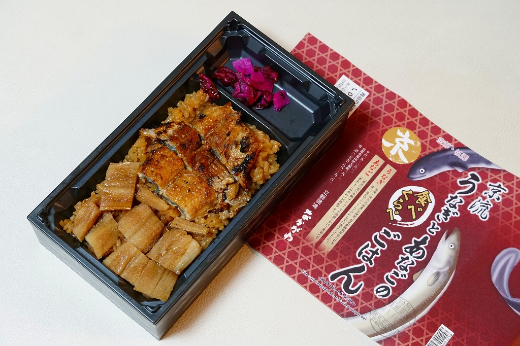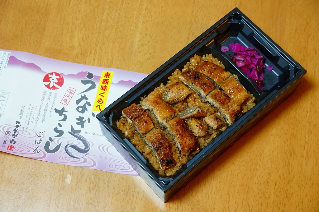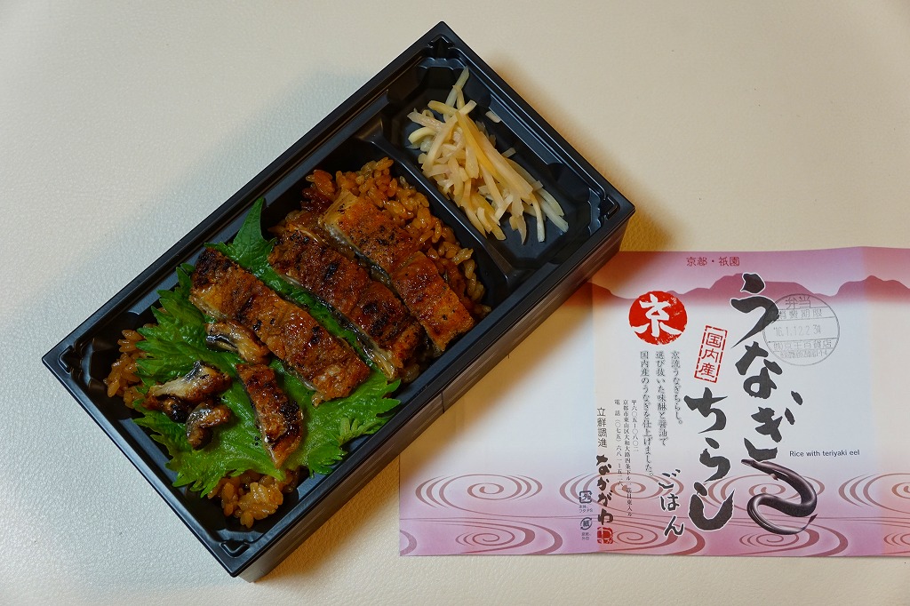 2018(平成30)年1月の京王百貨店の駅弁大会で実演販売。タレ御飯をウナギ蒲焼で覆い、ちりめんと柴漬けを少々添付。味は見てのとおりの鰻重。ウナギ御飯の味が強いので、ちりめんは食感だけに留まる感じ。前年の「うなぎちらしごはん」と違い、これは京王百貨店の駅弁大会でのみ販売し京都駅で売らなかった疑義駅弁だった模様。