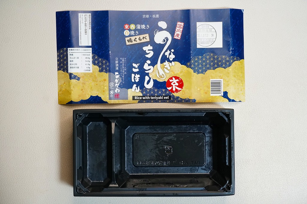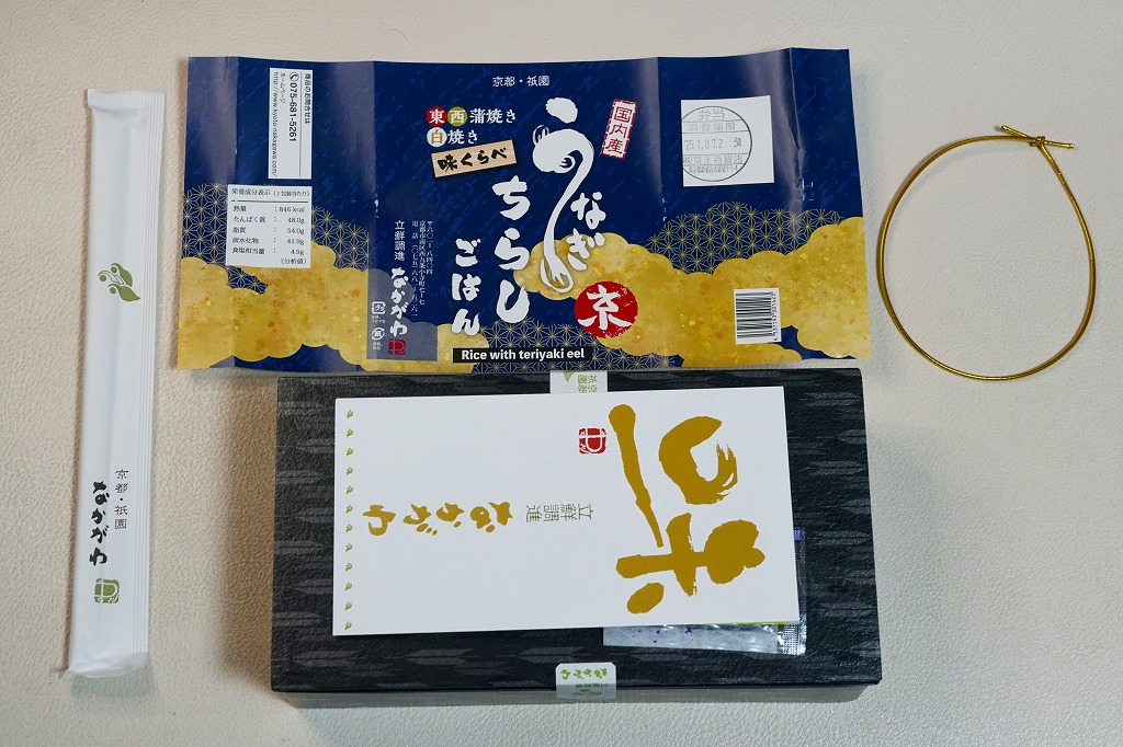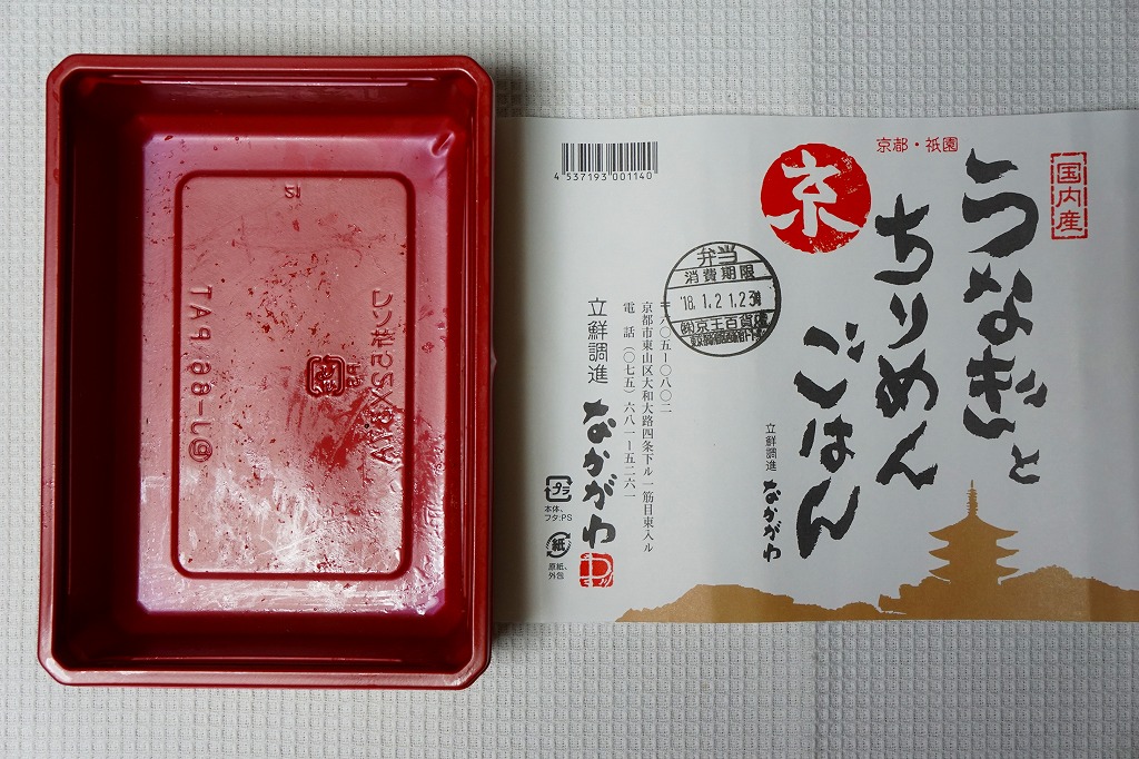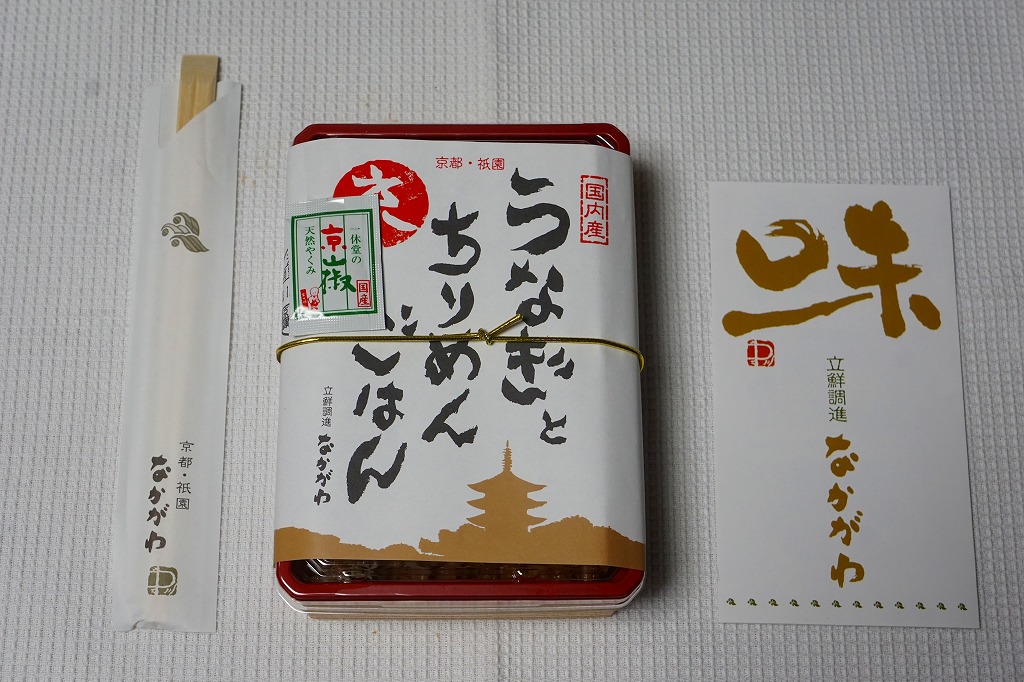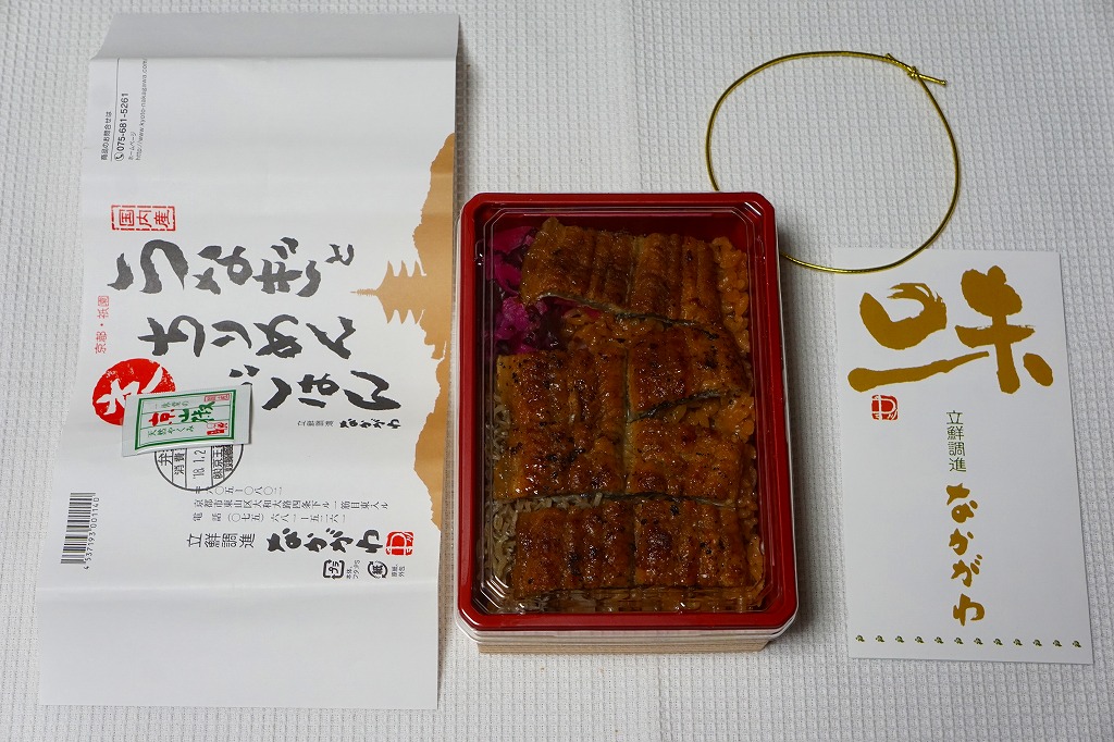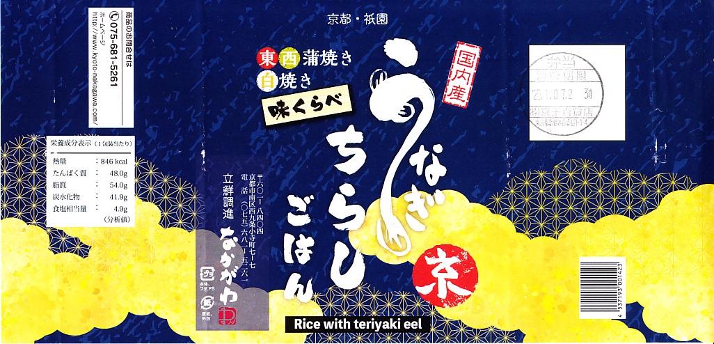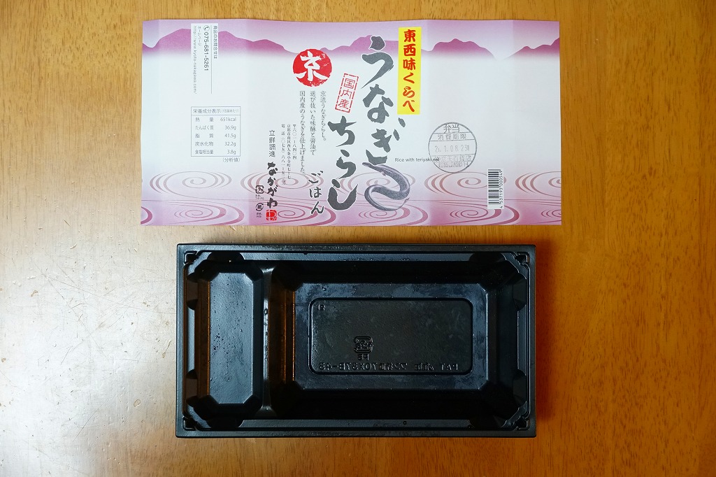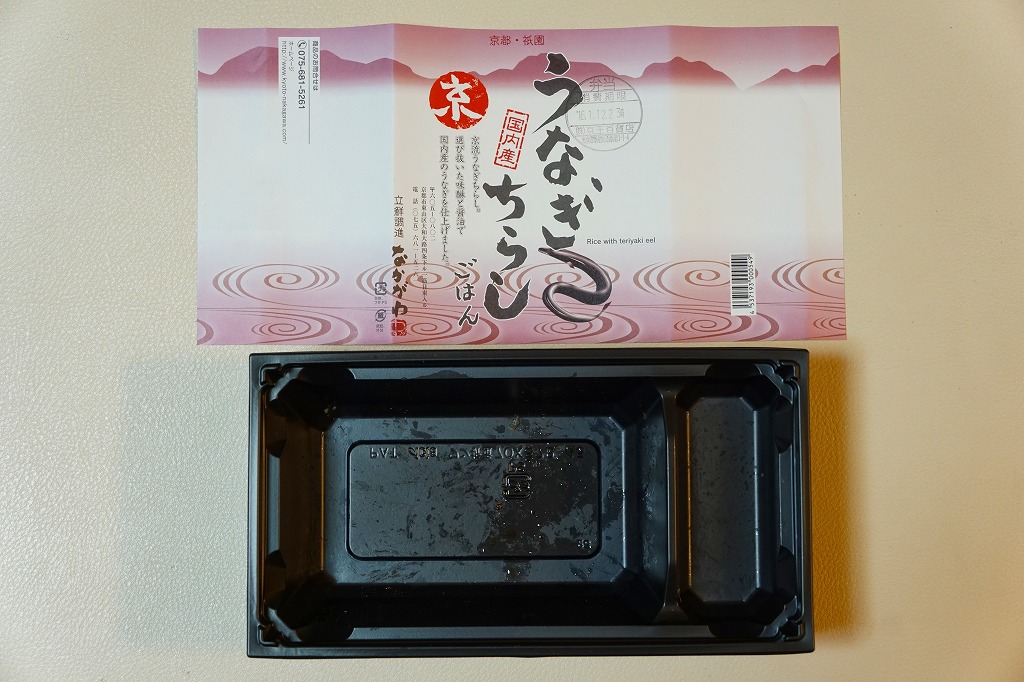 2018(平成30)年1月の京王百貨店の駅弁大会で実演販売。タレ御飯をウナギ蒲焼で覆い、ちりめんと柴漬けを少々添付。味は見てのとおりの鰻重。ウナギ御飯の味が強いので、ちりめんは食感だけに留まる感じ。前年の「うなぎちらしごはん」と違い、これは京王百貨店の駅弁大会でのみ販売し京都駅で売らなかった疑義駅弁だった模様。