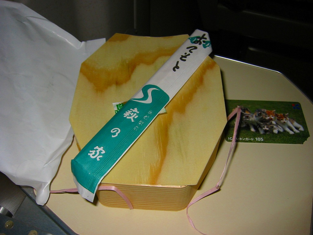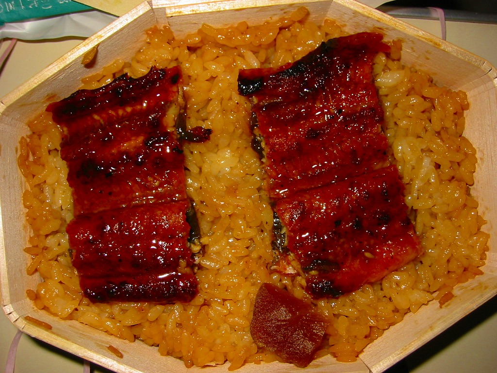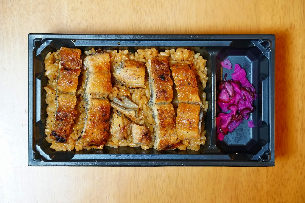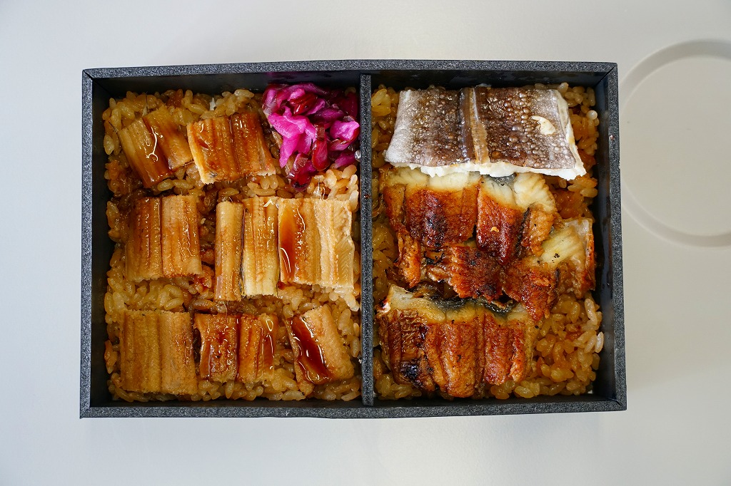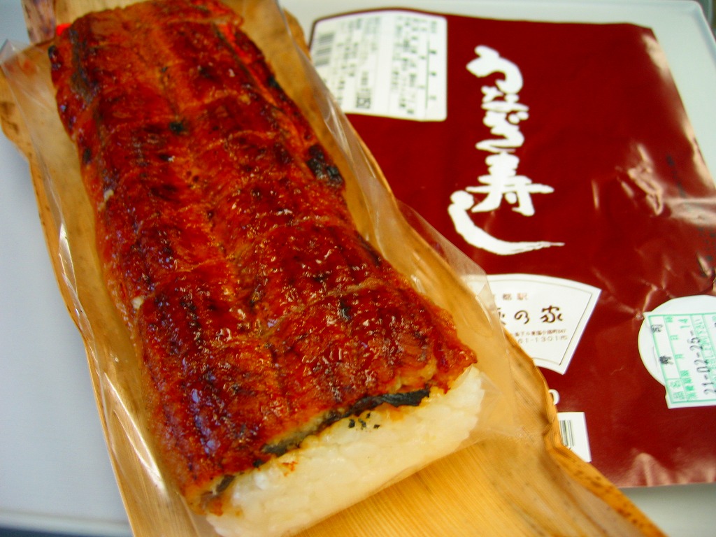 タレが染み込んだ御飯の上に鰻蒲焼が3切れ載る鰻重を、経木の細長い細長い長方形の容器に詰める。京都の町家建築からヒントを得た駅弁だろう。味はよいがずいぶんと高価だという評価がよく聞こえてきて、在来線エリアでは見かけず新幹線改札内で取り扱われているという販売形態は正しそう。