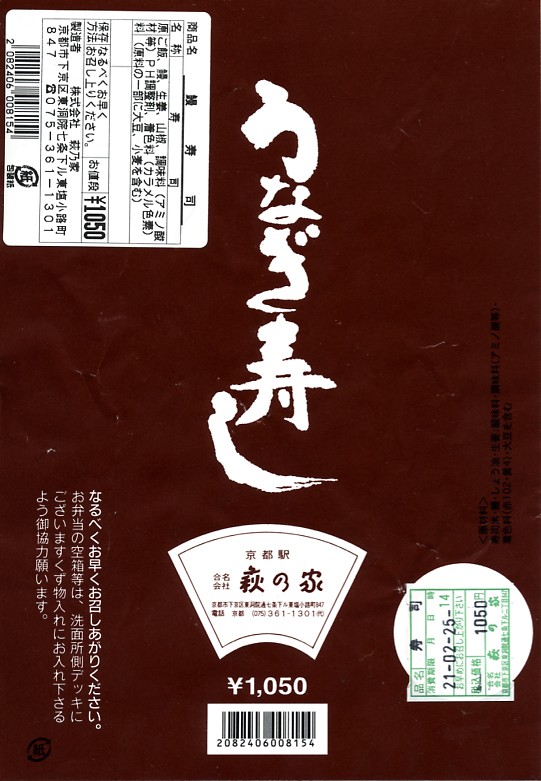 写真のとおりウナギの棒寿司が1本、竹皮に包まれて、ひもでしばられて、写真もイラストも何もない掛紙に巻かれている。風味はなかなかまともなもの。地味が過ぎて今では誰も紹介してくれなくなっているが、京都駅の駅弁屋「萩の家」のウナギ駅弁は1909(明治42)年以来の伝統を持つ。京の歴史に比べればたいしたことはないけれど、大切にしたい鉄道の味である。