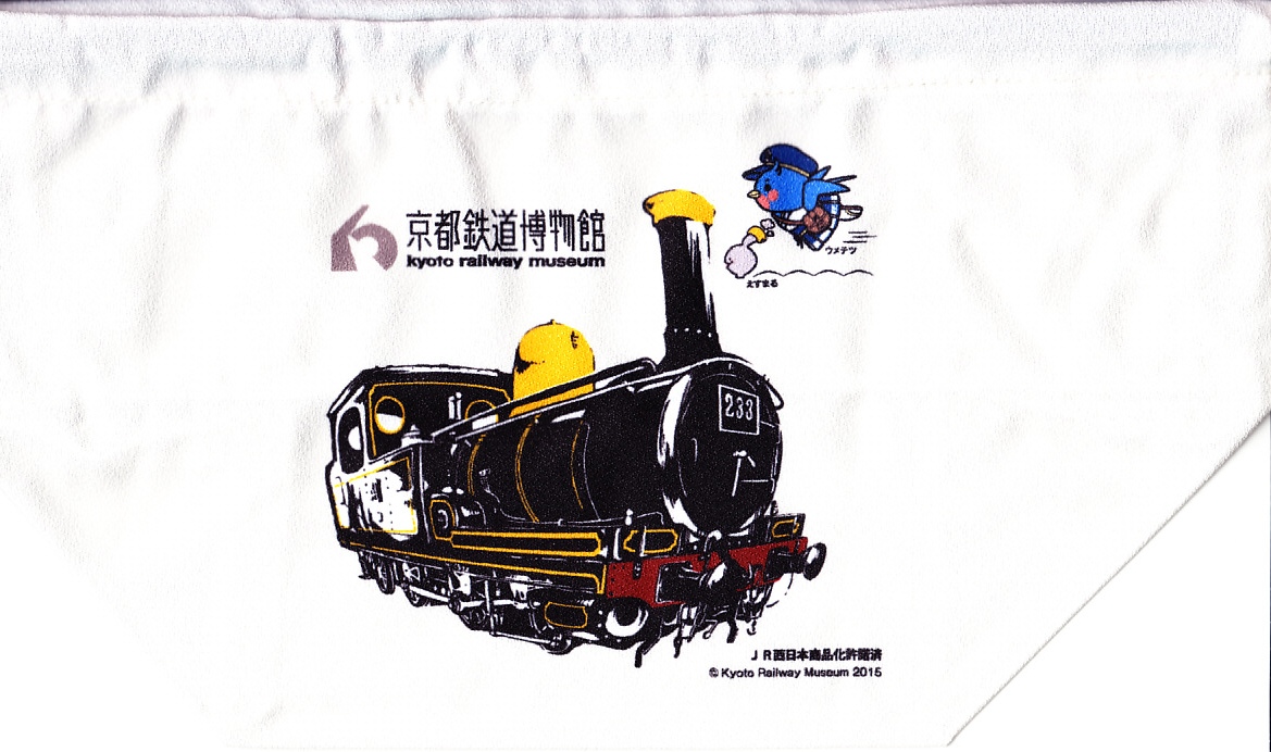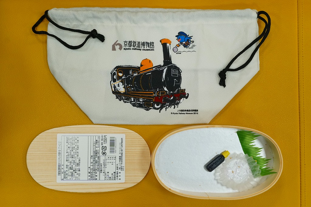 2021(令和3)年までに京都鉄道博物館で発売か。食品表示ラベルや売店掲示での商品名は「京都鉄博オリジナル巾着弁当」。その名のとおり、楕円形の小さな容器を、京都鉄道博物館の名とキャラクター「ウメテツ」と収蔵の233号機関車のイラストを載せたきんちゃく袋に詰める。