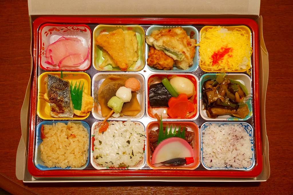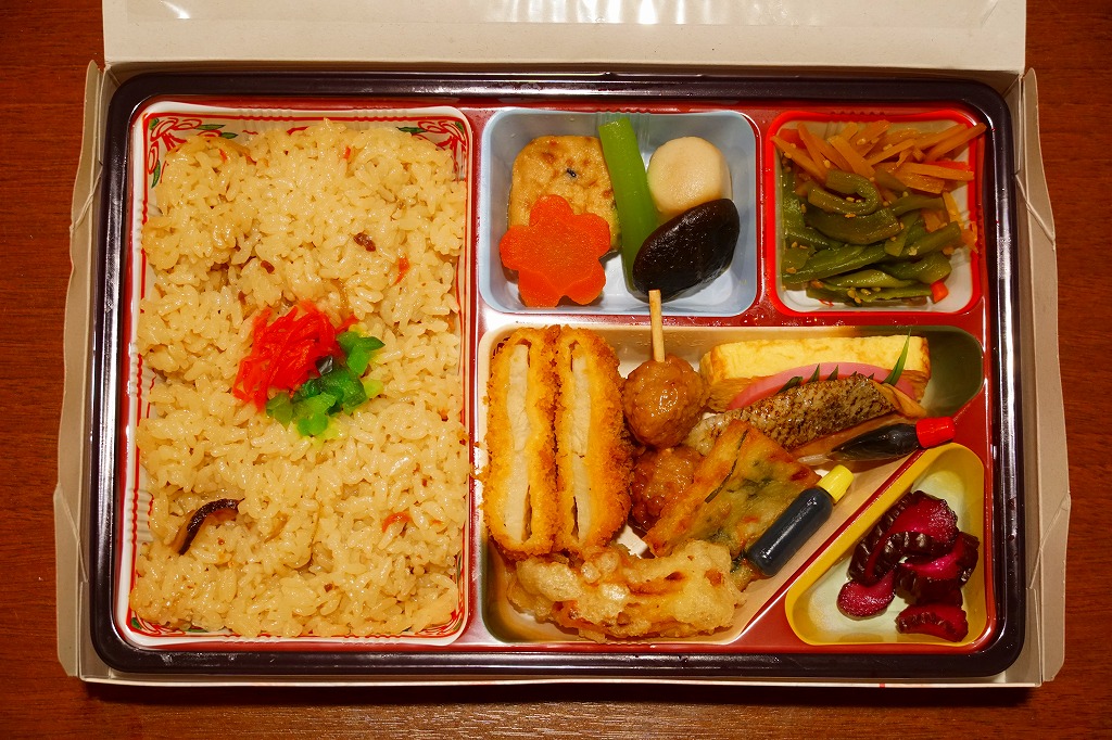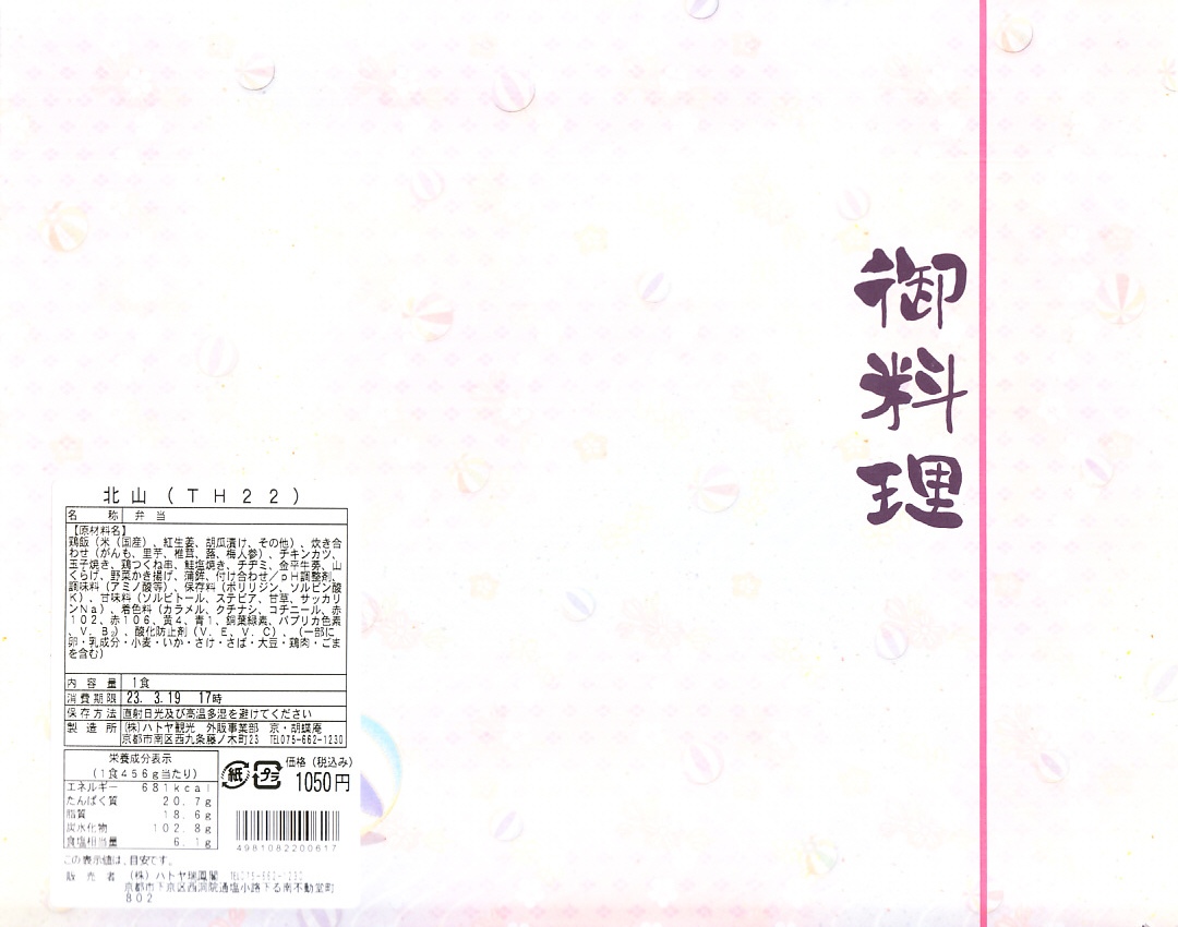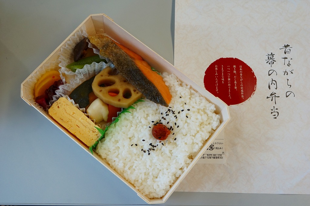 2021(令和3)年までに京都鉄道博物館で発売か。食品表示ラベルや売店掲示での商品名は「北山」。市販のボール紙製仕出し弁当向け容器を使用、器の絵柄を印刷した仕出し向けらしいプラ製トレーに、鶏飯、焼鮭とかまぼこと玉子焼、チキンカツ、鶏つくね串、チヂミ、きんぴらごぼう、里芋や椎茸などの炊き合わせ、山くらげ、野菜かき揚げなどを盛り付ける。まるで慶弔や会議のお弁当。こういうものが観光施設で買われることは、京都らしさなのかどうか、きっとそうでないと思う。営業事業者の変更により2024年8月限りで終売、9月からは神戸の駅弁が売られる。