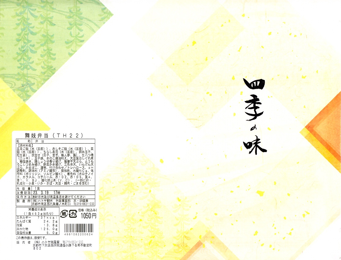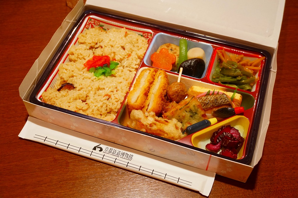 2021(令和3)年までに京都鉄道博物館で発売か。食品表示ラベルや売店掲示での商品名は「舞妓弁当」。市販のボール紙製仕出し弁当向け容器を使用、器の絵柄を印刷した仕出し向けらしいプラ製トレーに、五目ご飯、赤しそご飯、菜飯、ちらし寿司、サトイモなどの炊合せ、玉子焼と鯖塩焼き、きのこ醤油和え、蛋白しぐれ煮とかまぼこ、鶏肉の香り揚げ、野菜かき揚げ、生八つ橋と三色串天、漬物で12区画。営業時間も展示内容も客層も、酒向けでない施設で売られる、おつまみ弁当。営業事業者の変更により2024年8月限りで終売、9月からは神戸の駅弁が売られる。