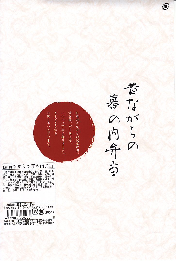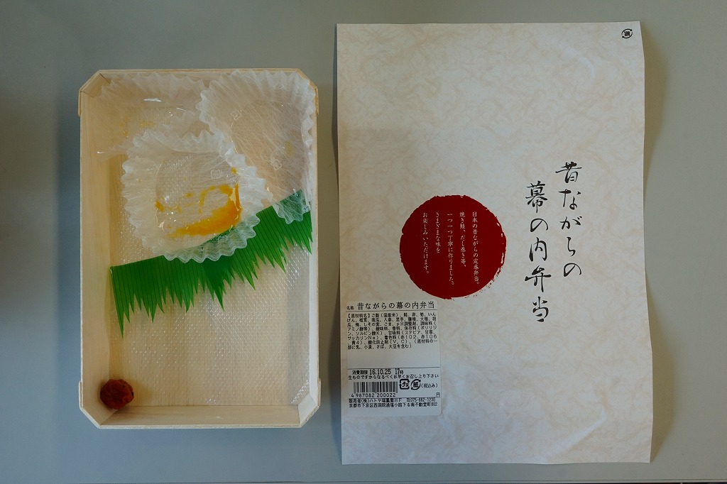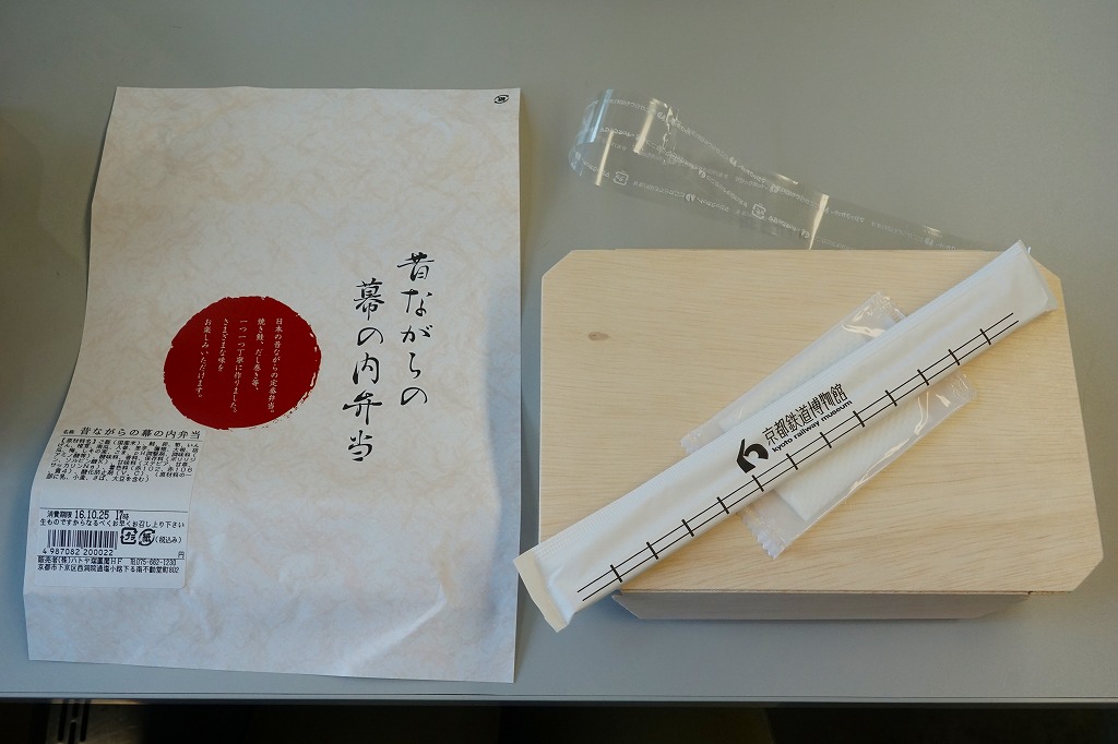 2016(平成28)年4月29日の京都鉄道博物館の開館と同時にデビューした館内弁当のひとつ。掛紙の意匠はまるで日の丸弁当。木質エコ容器の中身は半分がそんな日の丸弁当、御飯の中央に梅干しを配置したもので、半分は焼鮭、玉子焼、煮物類、漬物類。見栄えに加えて御飯の多さとおかずの少なさでも、古風な駅弁を思わせる。2017(平成29)年までに終売か。