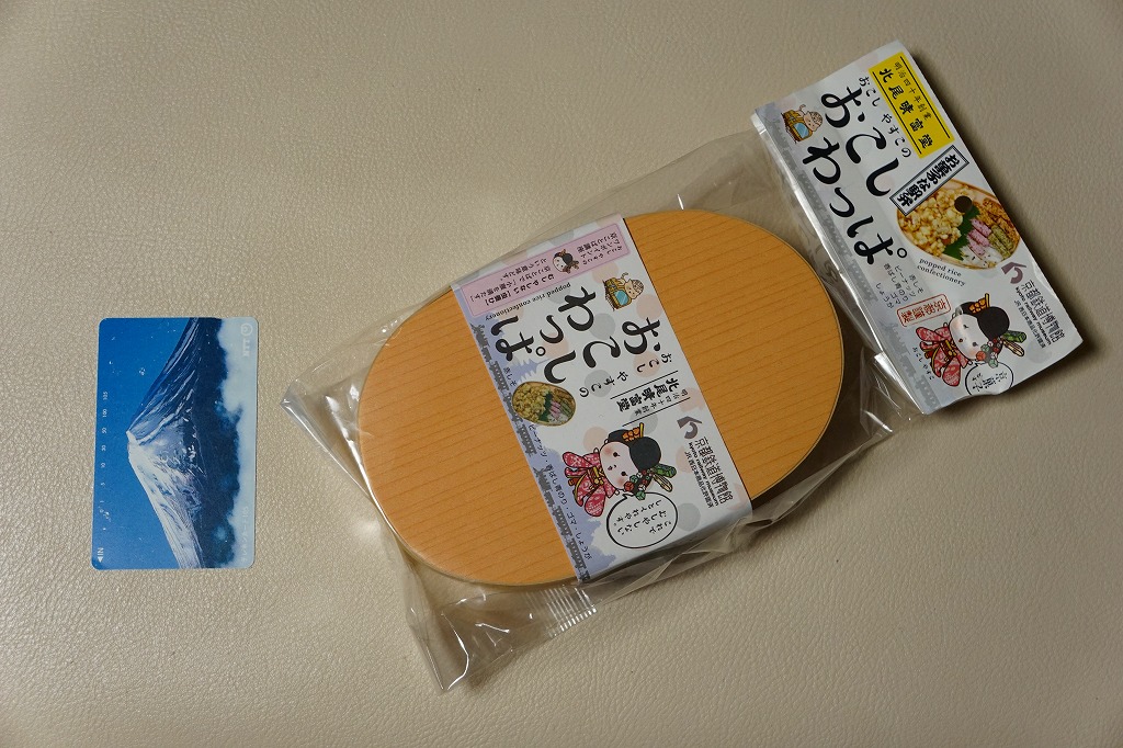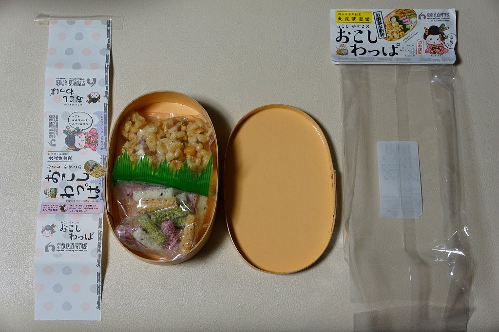 京都鉄道博物館の売店で買えた「駅弁」。木目柄のボール紙でできた楕円形の容器に、赤しそ、香ばし青のり、ゴマ、しょうがのおこしと、ピーナッツのおこしが、それぞれ袋詰めで収まる。容器も丸ごと袋詰め。ということでこれは、駅弁の姿をしたお菓子。姿は小さく軽いのに、値段は普通の駅弁に匹敵する高さ。