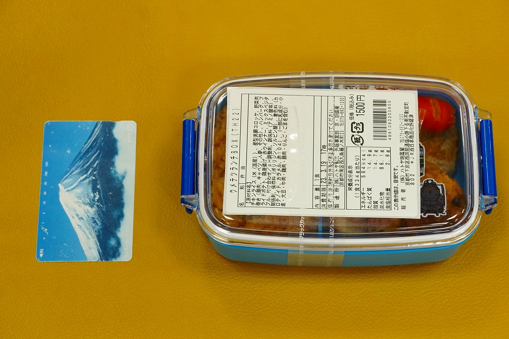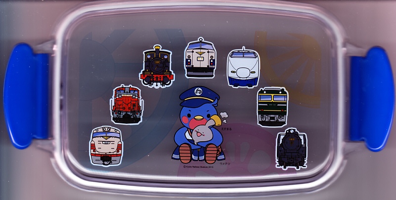2016(平成28)年10月25日に購入した、京都鉄道博物館のお弁当のふたと添付物。上記の2023年のものと、容器も中身もほぼ変わらない。当時は京都鉄道博物館のキャラクター「ウメテツ」のシールを添付したほか、ふたに描く収蔵車両のアイコンの数や位置が異なる。