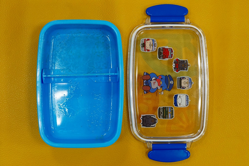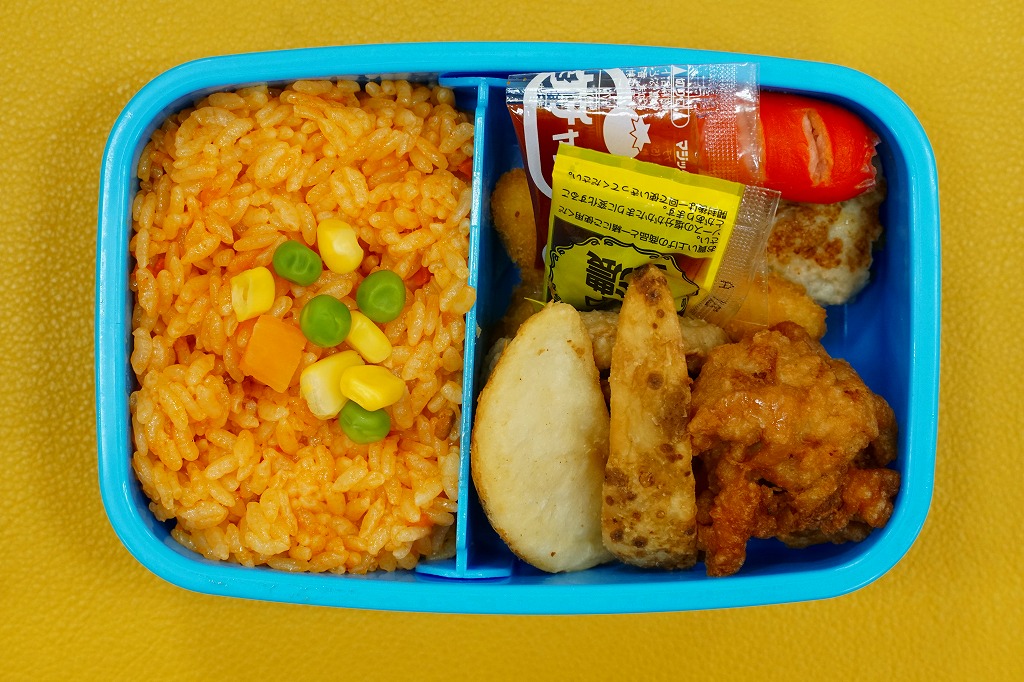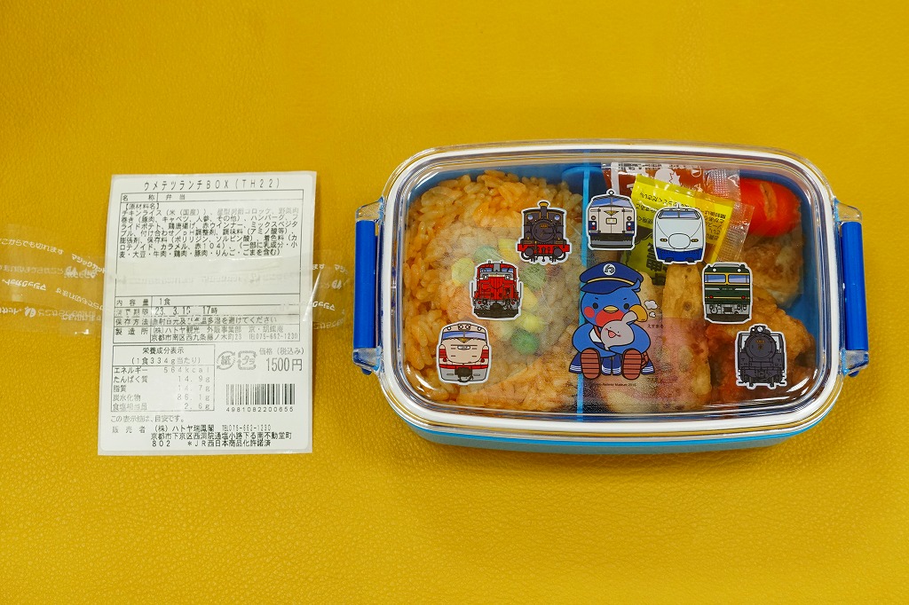 2016(平成28)年4月29日の京都鉄道博物館の開館と同時にデビューした館内弁当のひとつ。使い捨てるものでない市販レベルの青い弁当箱には、博物館のキャラクター「ウメテツ」や、収蔵車両のアイコン7点が描かれる。中身はチキンライスに鶏唐揚、ウインナー、フライドポテト、コロッケ、ハンバーグ、ソース、ケチャップなどという、サイズも分量もコンパクトなお子様ランチ。営業事業者の変更により2024年8月限りで終売、9月からは神戸の駅弁が売られる。