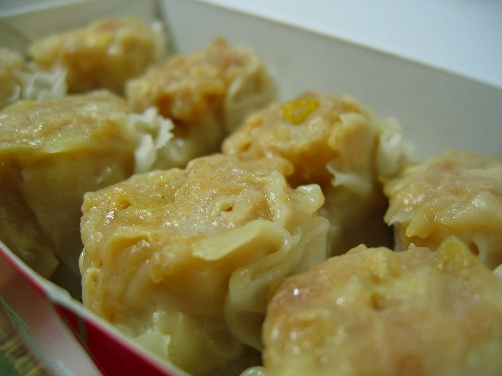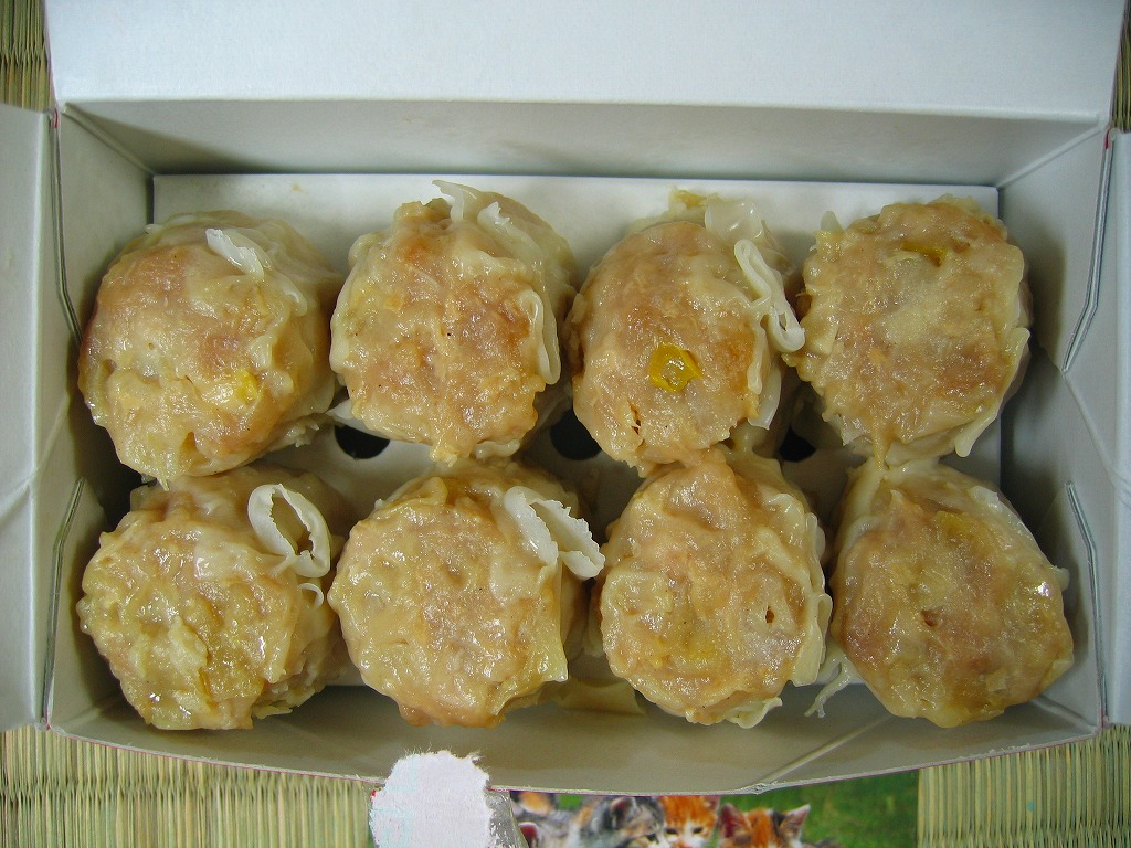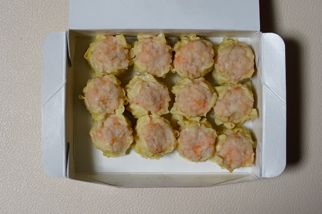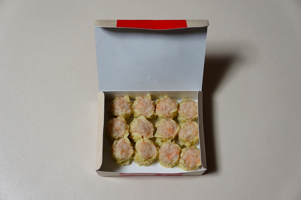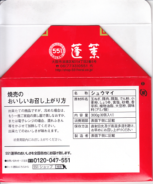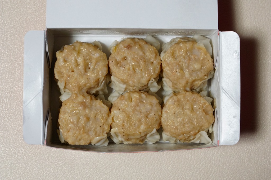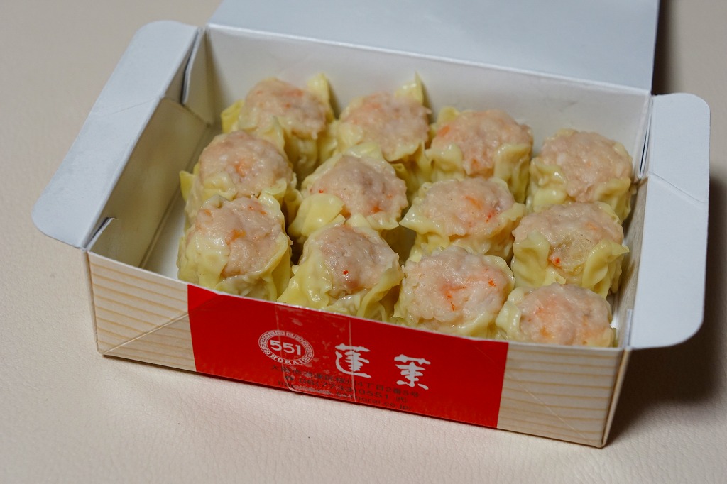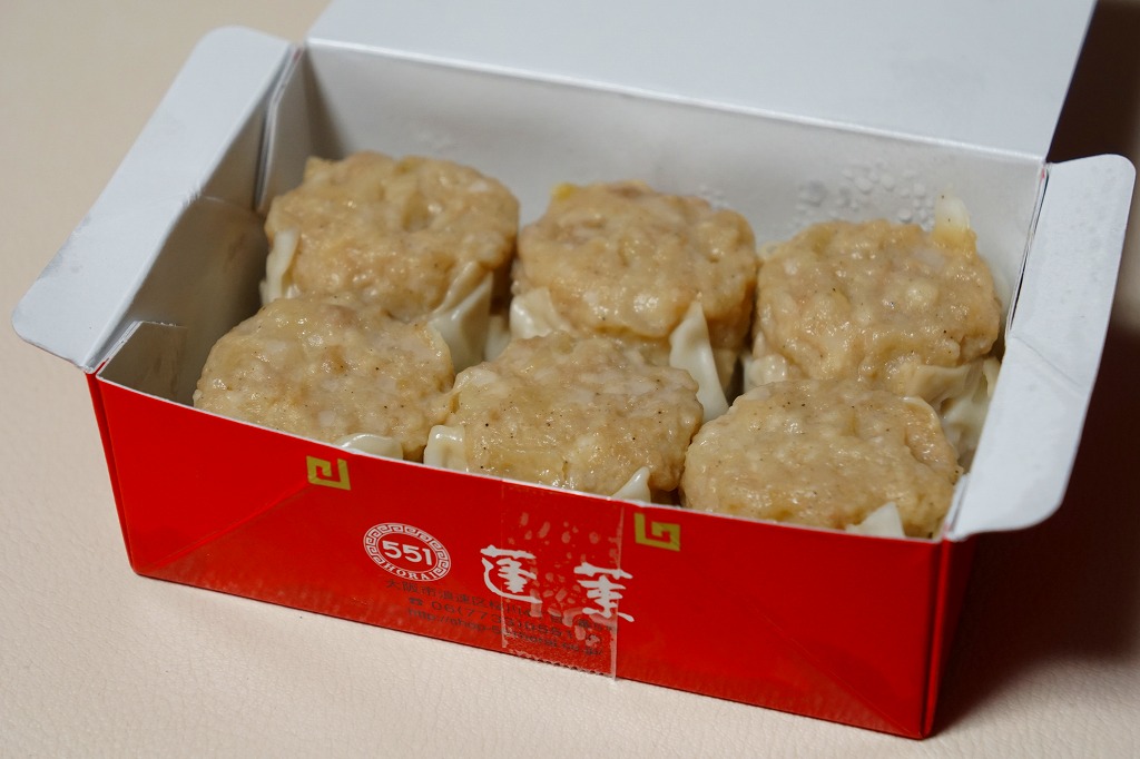 大阪人なら誰もが知る551(ごーごーいち)の、売店で豚饅とともに売られる焼売。赤いボール紙の箱に、もっちり太った焼売が6個収まる。豚饅とだいたい、同じ味がすると思う。価格は2015年の購入時で390円、2023年時点で450円、10個入りなら750円。