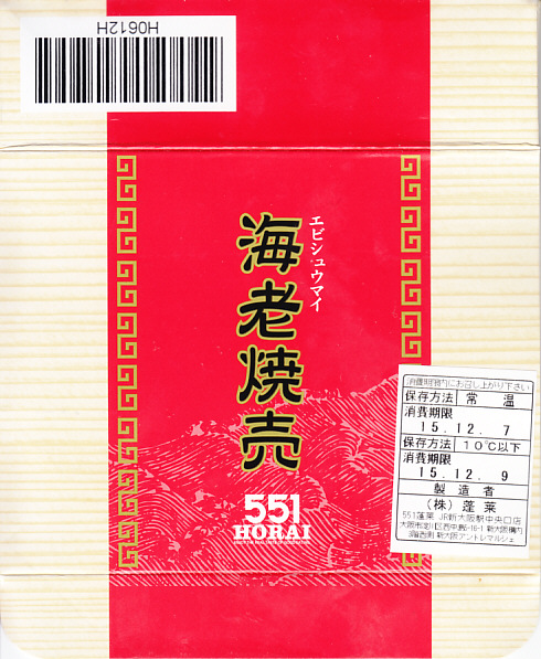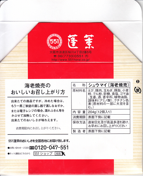大阪人なら誰もが知る551(ごーごーいち)の、売店で豚饅とともに売られるエビしゅうまい。赤いボール紙の箱に、コリコリとした食感の小さな焼売が12個収まる。他の551の商品と違い、物足りないくらい臭みがない。価格は2015年の購入時で600円、2023年時点で660円、20個入りなら1,100円。