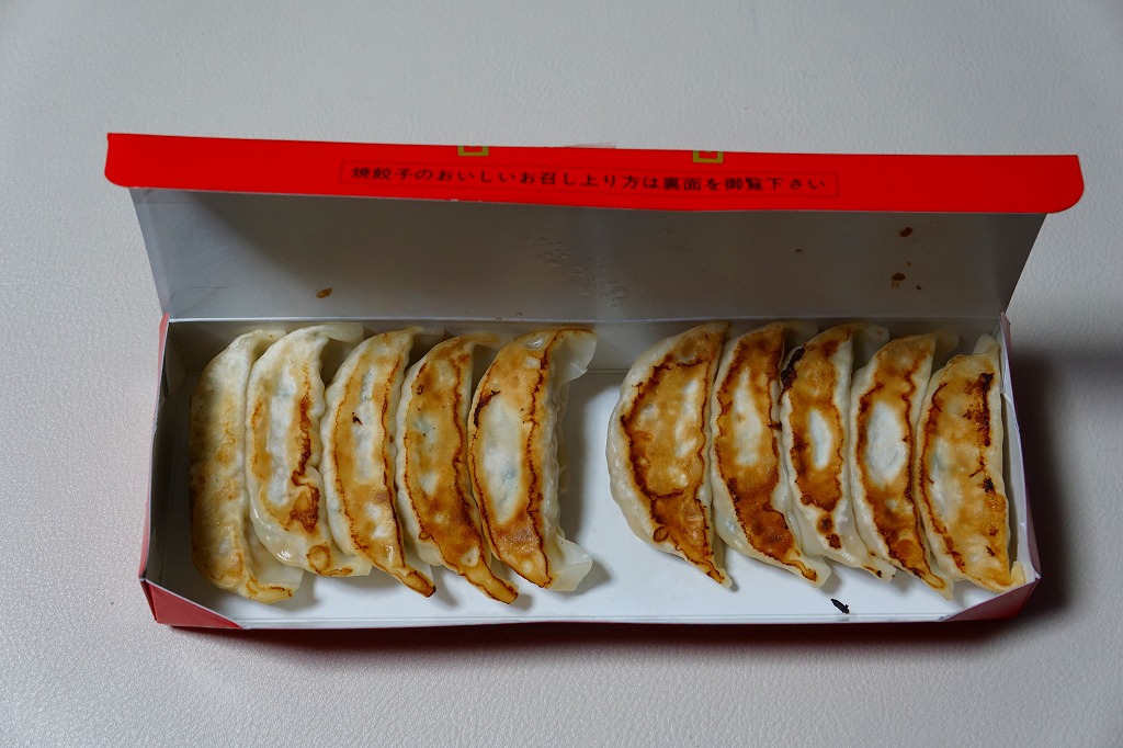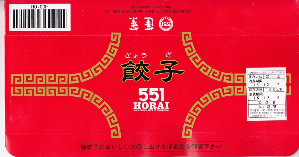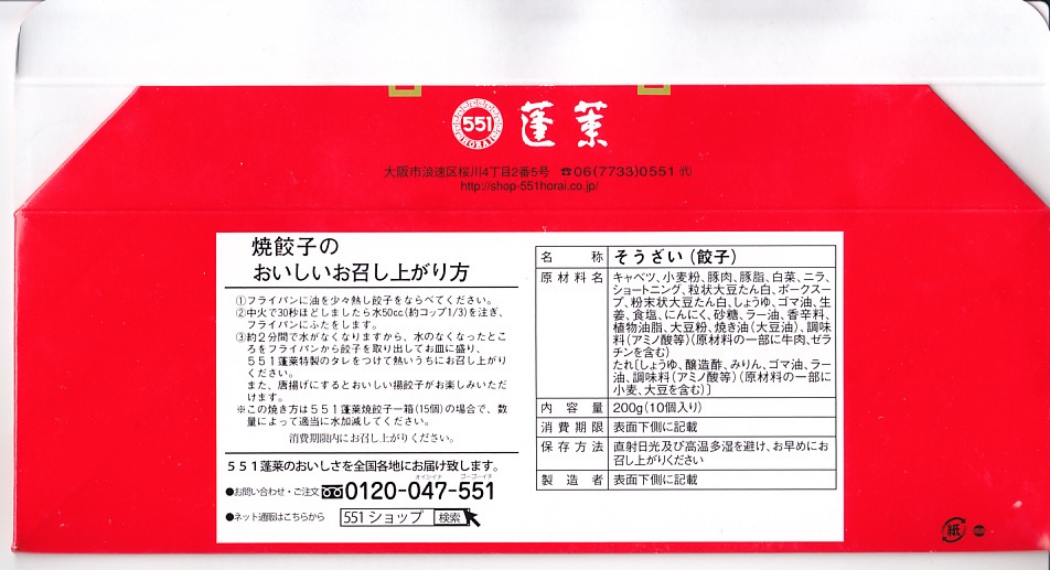 大阪人なら誰もが知る551(ごーごーいち)の、売店で豚饅とともに売られる餃子。赤いボール紙の箱に、ふんわり、しっとりした焼き餃子が10個収まる。551の商品は売り場で作るため、食品表示ラベル上の製造者には売店の名前と所在地が記される。価格は2015年の購入時で300円、2023年時点で360円、15個入りなら540円。