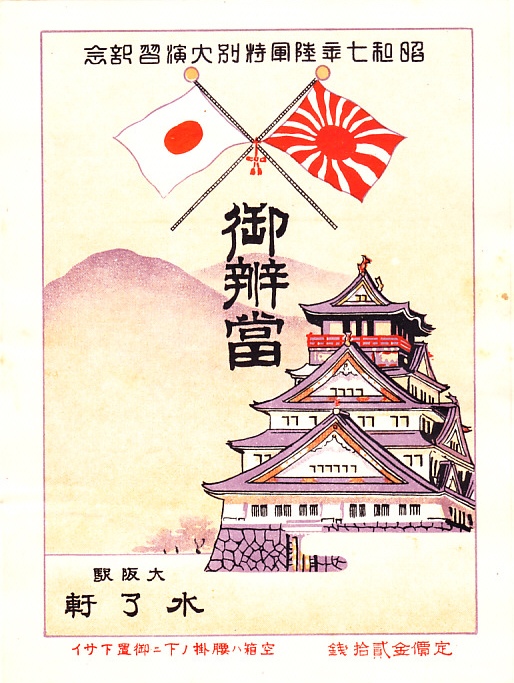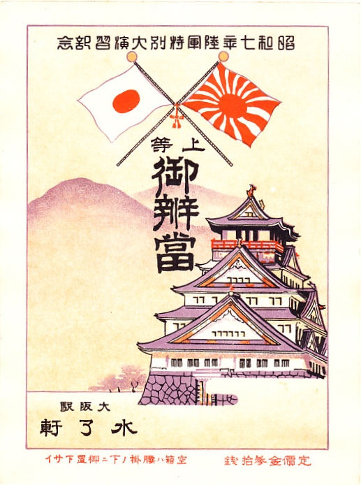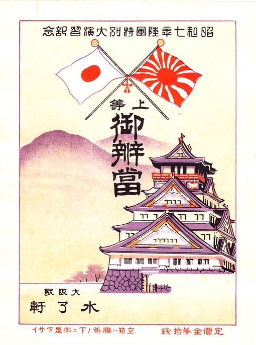記載事項から1932(昭和7)年のものと思われる、昔の大阪駅弁の掛紙。「昭和七年陸軍特別大演習記念」ということで、1932年11月に奈良と大阪で開催された陸軍特別大演習、天皇が参加した大規模な軍事イベントの頃に、大阪駅の駅弁で使われたのだろう。国旗の日の丸と陸軍の旭日旗に大阪城を描いた。