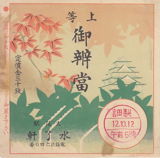 1937(昭和12)年10月12日5時の調製と思われる、昔の大阪駅弁の掛紙。大阪城に紅葉を被せたような、秋の絵柄。