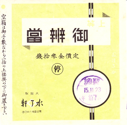 1940(昭和15)年11月23日の調製と思われる、昔の大阪駅弁の掛紙。特徴のない絵柄であるが、1939年9月の物価等統制令に基づくマル停マークがあり、戦時の掛紙であることがわかる。