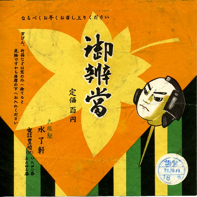 1956(昭和31)年10月19日16時の調製と思われる、昔の大阪駅弁の掛紙。幕の内弁当とは書かれていないが、定式幕(じょうしきまく)の色遣いで、掛紙のデザインが幕の内を表しているような。