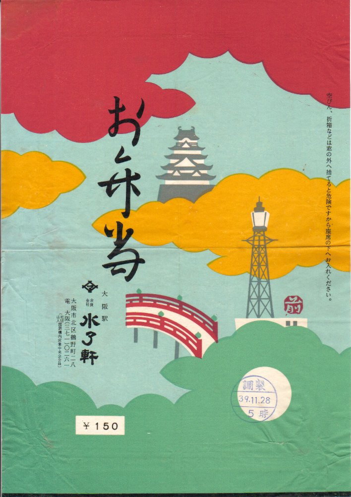 1964(昭和39)年11月28日の調製と思われる、昔の大阪駅弁の掛紙。東海道新幹線の開業から約2か月後。中身はおそらく並等幕の内弁当と思われる。大阪城と通天閣と住吉大社かどうか、大阪の名物が描かれた模様。