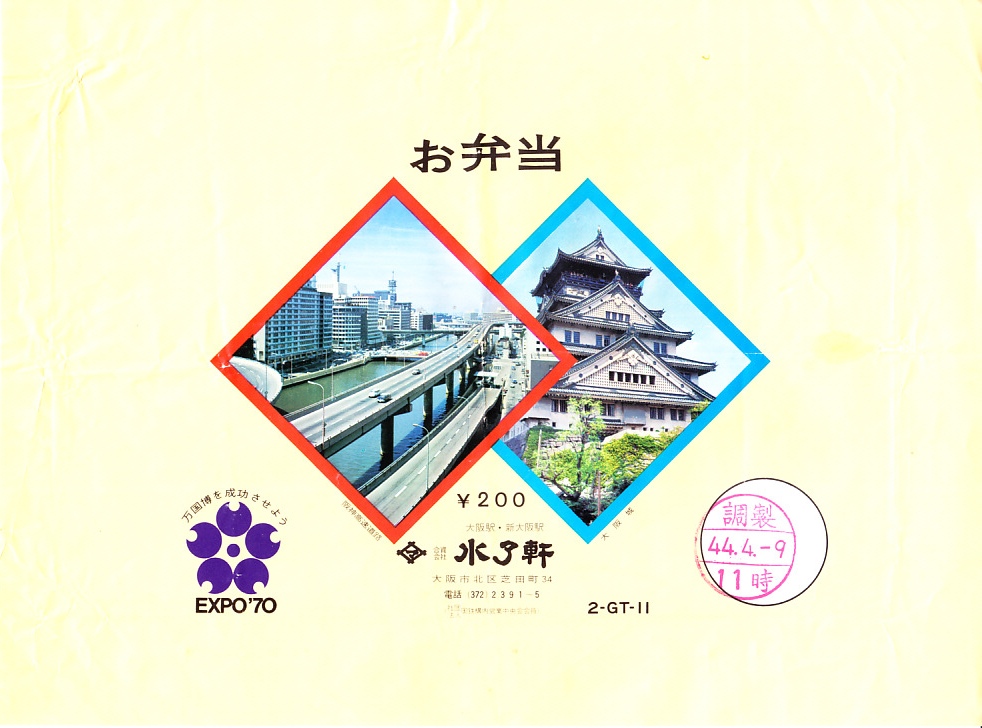 1969(昭和44)年4月9日11時の調製と思われる、昔の大阪駅弁と新大阪駅弁の掛紙。大阪城と高速道路と万博マークを、淡々と使った感じ。
