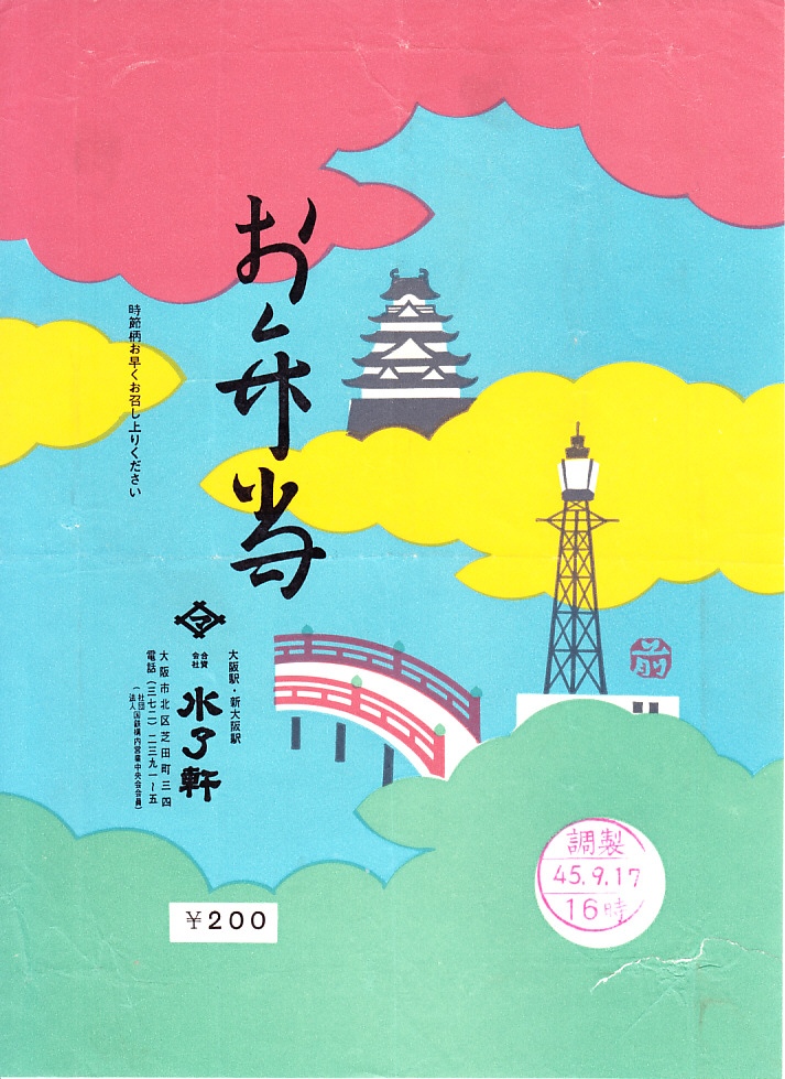 1970(昭和45)年9月17日16時の調製と思われる、昔の大阪駅と新大阪駅の駅弁の掛紙。絵柄は下記の1964年のものから変わらない。