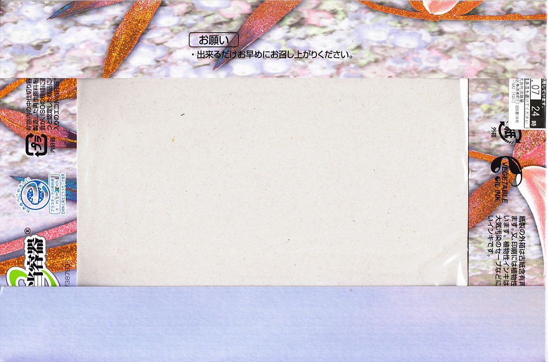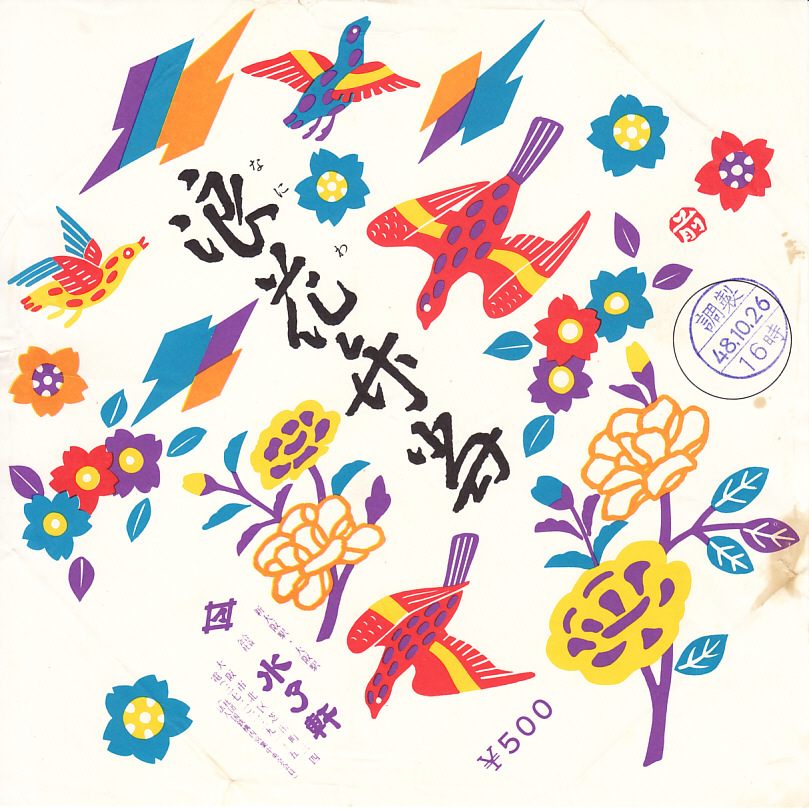 1973(昭和48)年10月26日16時の調製と思われる、昔の大阪駅弁の掛紙。どぎつい色彩の花と鳥でできた絵柄。こういう名前の駅弁は、おそらく幕の内弁当だと思う。