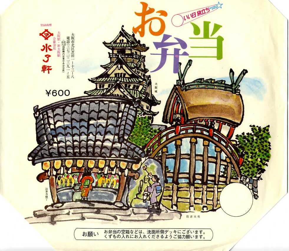 1980年代、昭和50年代のものと思われる、昔の大阪駅弁の掛紙。大阪城や住吉大社のポップなイラストを掲載する。