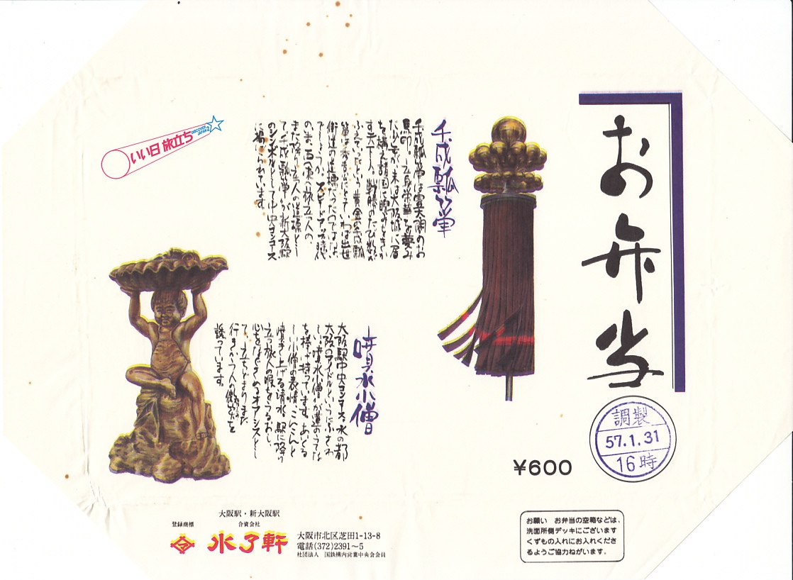 1982(昭和57)年1月31日16時の調製と思われる、昔の大阪駅弁の掛紙。下記の1977年11月の掛紙の、絵柄を変えずにレイアウトを変えて、国鉄の観光キャンペーン「いい日旅立ち」のロゴマークを加えた。