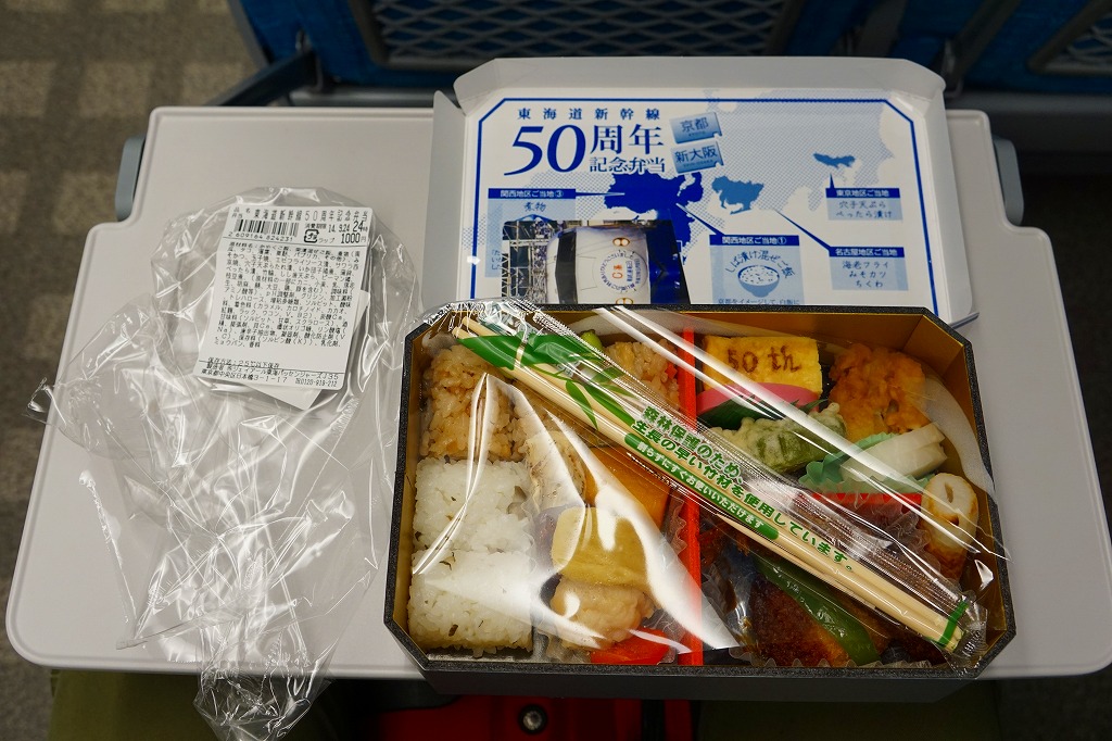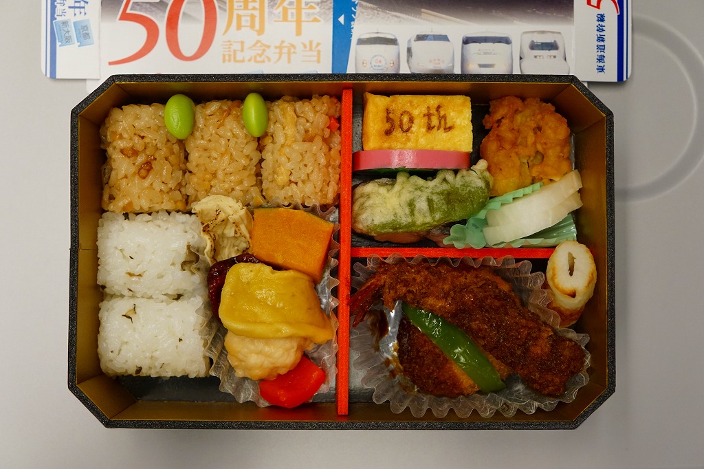 この「京都・新大阪」バージョンの中身は、 鶏飯としば漬け混ぜ御飯の俵飯、焼き湯葉、 エビフライ、みそかつ、イイダコ煮、イカ団子、アナゴ天、サワラ西京焼、50th焼き印の玉子焼など。そんな内容の割には、見た目も味も整然としている。後に3バージョンを統合した「東海道新幹線弁当」として、2015(平成27)年4月2日にレギュラー商品化した。