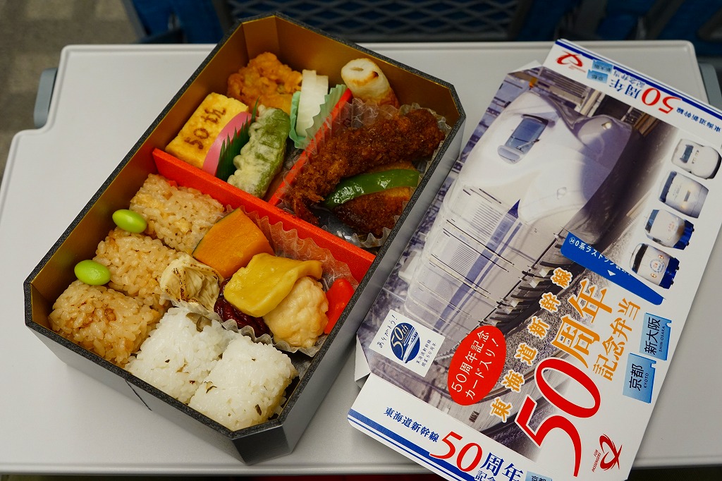 東海道新幹線の開業50周年を記念して、「東京・品川・新横浜」「名古屋」「京都・新大阪」の3種類を、2014(平成26)年4月1日から12月まで販売した記念駅弁。販売期間の前半と後半で異なる絵柄のふたを使い、この写真は後半版。さらに全50種類の中から1枚の記念カードを添付するといい、東海道新幹線の駅弁では珍しく、コレクター仕様を取り入れた。